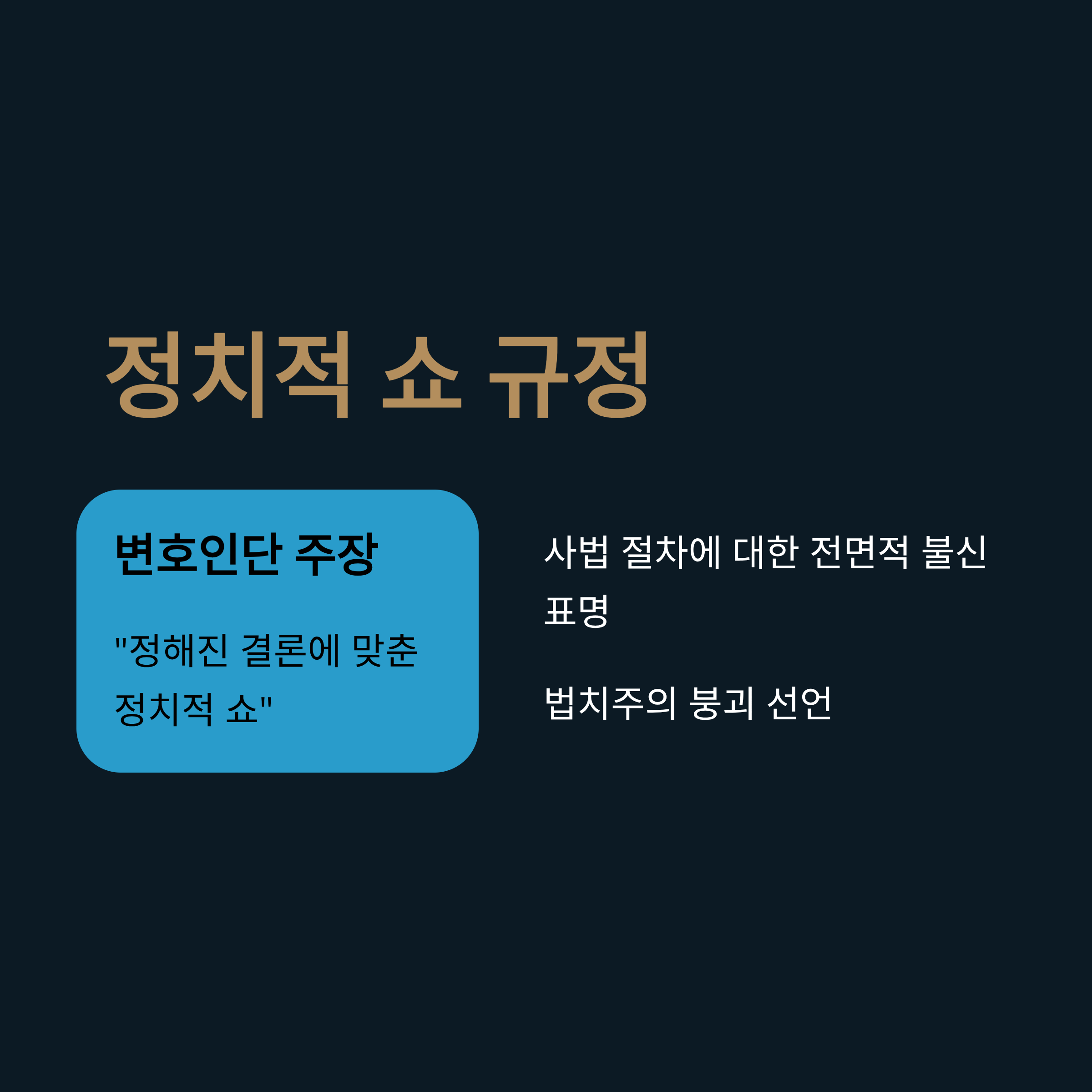 변호인단은 이러한 행태가 법리와 증거에 입각한 재판이 아니라, 정치적 목적을 달성하기 위해 사법 절차를 요식행위로 전락시킨 것이라고 강하게 성토하고 있습니다. 이는 법치주의의 근간인 적법 절차의 원칙이 피고인에 따라 다르게 적용되고 있음을 시사하며, 사법부 전체의 신뢰성을 근본적으로 뒤흔드는 심각한 문제입니다.
