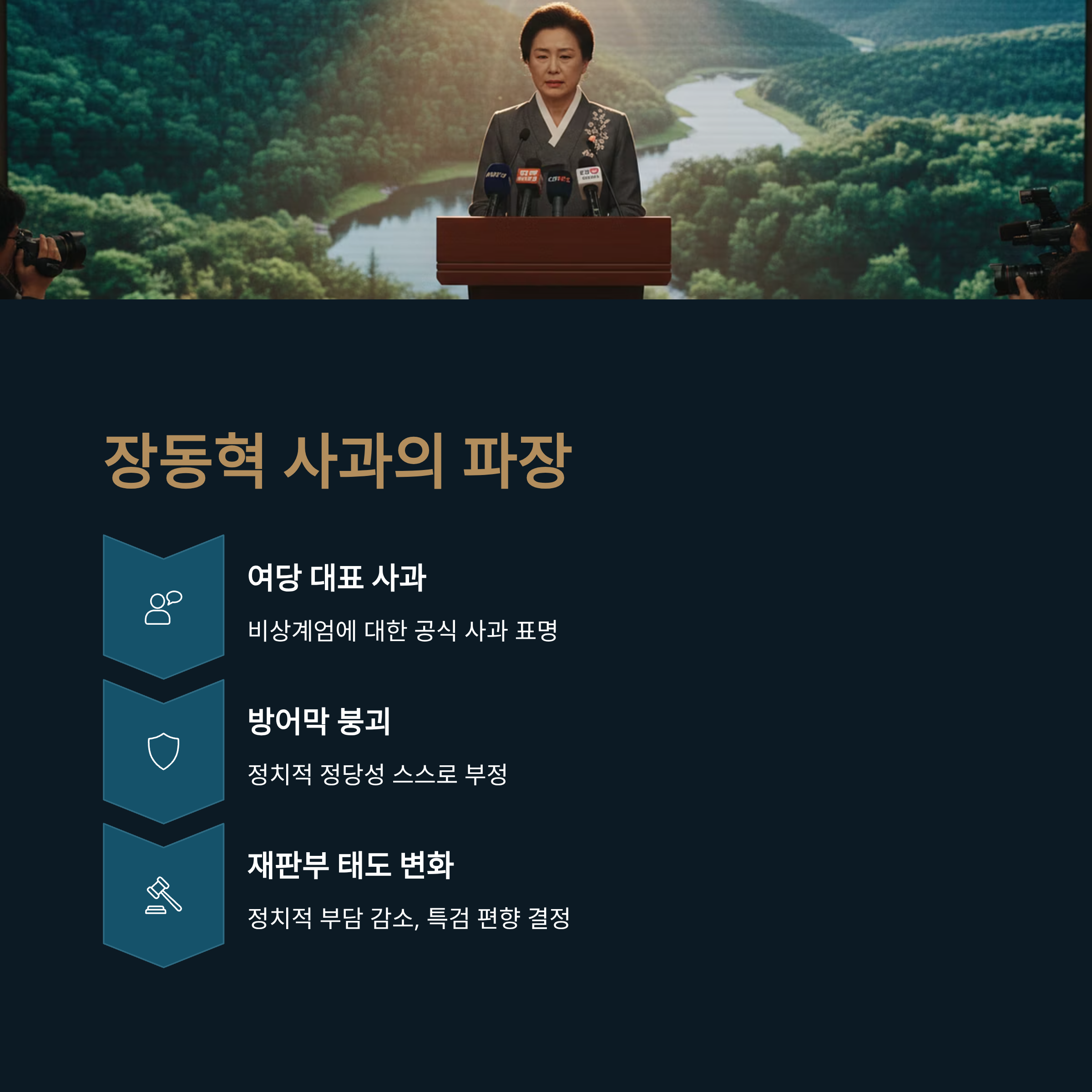 이번 재판의 흐름을 바꾼 결정적 변수 중 하나는 정치권의 기류 변화입니다. 국민의힘 장동혁 대표가 윤석열 전 대통령의 비상계엄 선포에 대해 공식 사과를 표명한 시점과 재판부의 공소장 변경 허가 시점이 맞물려 있다는 점은 시사하는 바가 큽니다. 여당 대표의 사과는 사실상 윤 전 대통령의 행위를 정치적으로 방어하지 않겠다는 신호로 해석될 수 있습니다. 이러한 여권의 분열과 방어선 붕괴는 재판부가 여론과 정치적 부담을 덜고 특검의 손을 들어주는 배경이 되었을 가능성이 높습니다.