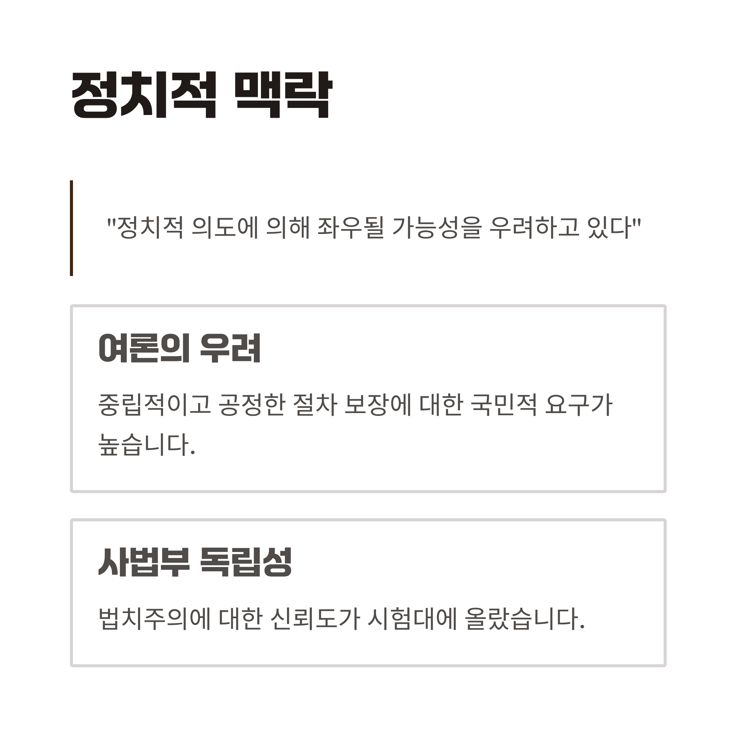 정치적 맥락에서 본 사건은 윤석열 대통령의 입지와 더불어 이전 정부와의 대립 양상에서도 영향을 받고 있다. 특히 이번 사건의 결과가 단순히 법적 논의를 떠나 이후 사회 여론 및 정치적 향방에 큰 영향을 줄 전망이다. 일부 국민들은 재판이 진행되는 동안 중립적이고 공정한 절차가 보장되지 않는다면, 정치적 의도에 의해 좌우될 가능성을 우려하고 있다. 이는 사법부의 독립성과 법치주의에 대한 더 큰 신뢰도를 요구하는 시대적 요청으로 연결된다.
