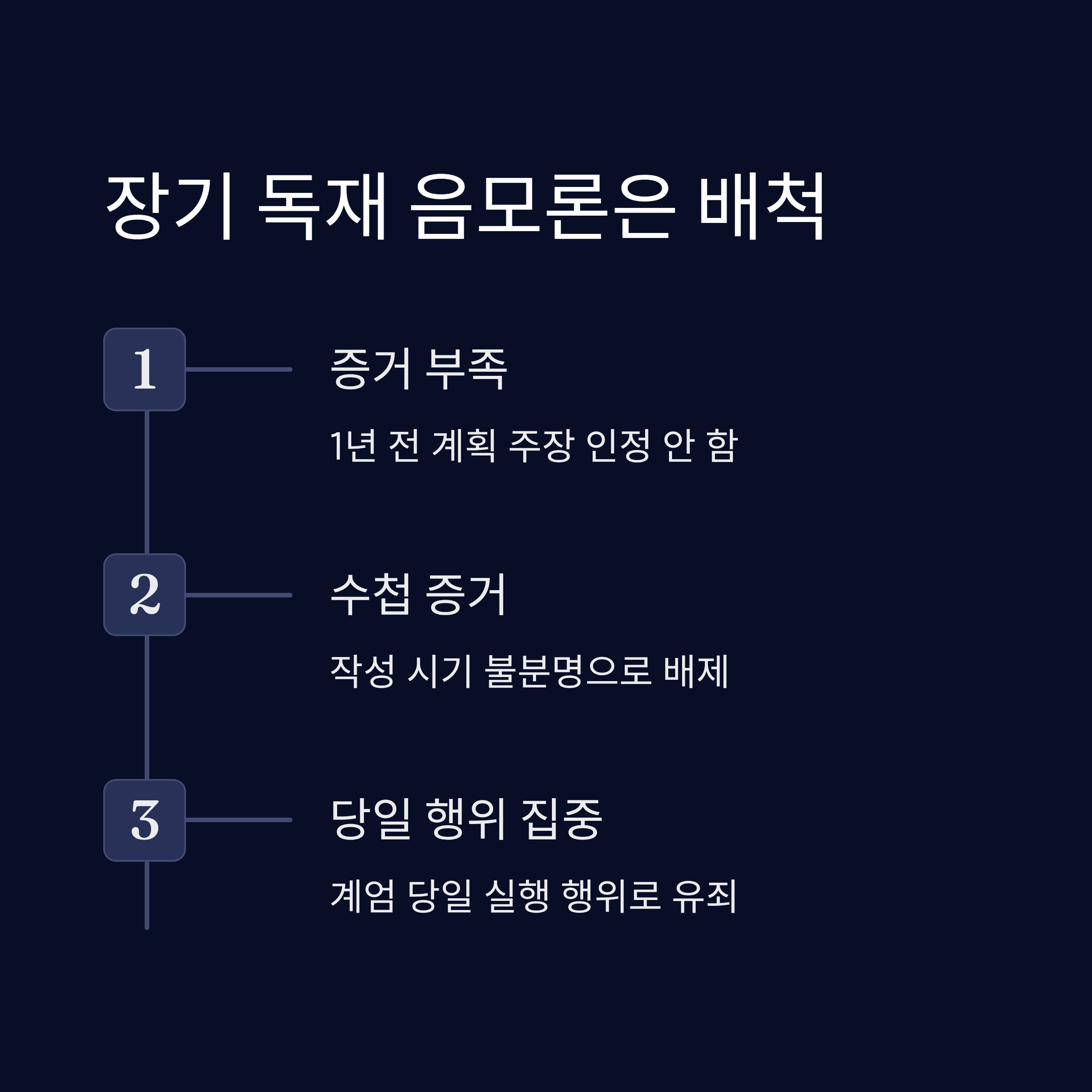장기 집권 음모는 증거 부족으로 배척했으나, 계엄 당일의 실행 행위 자체에 집중하여 유죄를 인정했습니다.