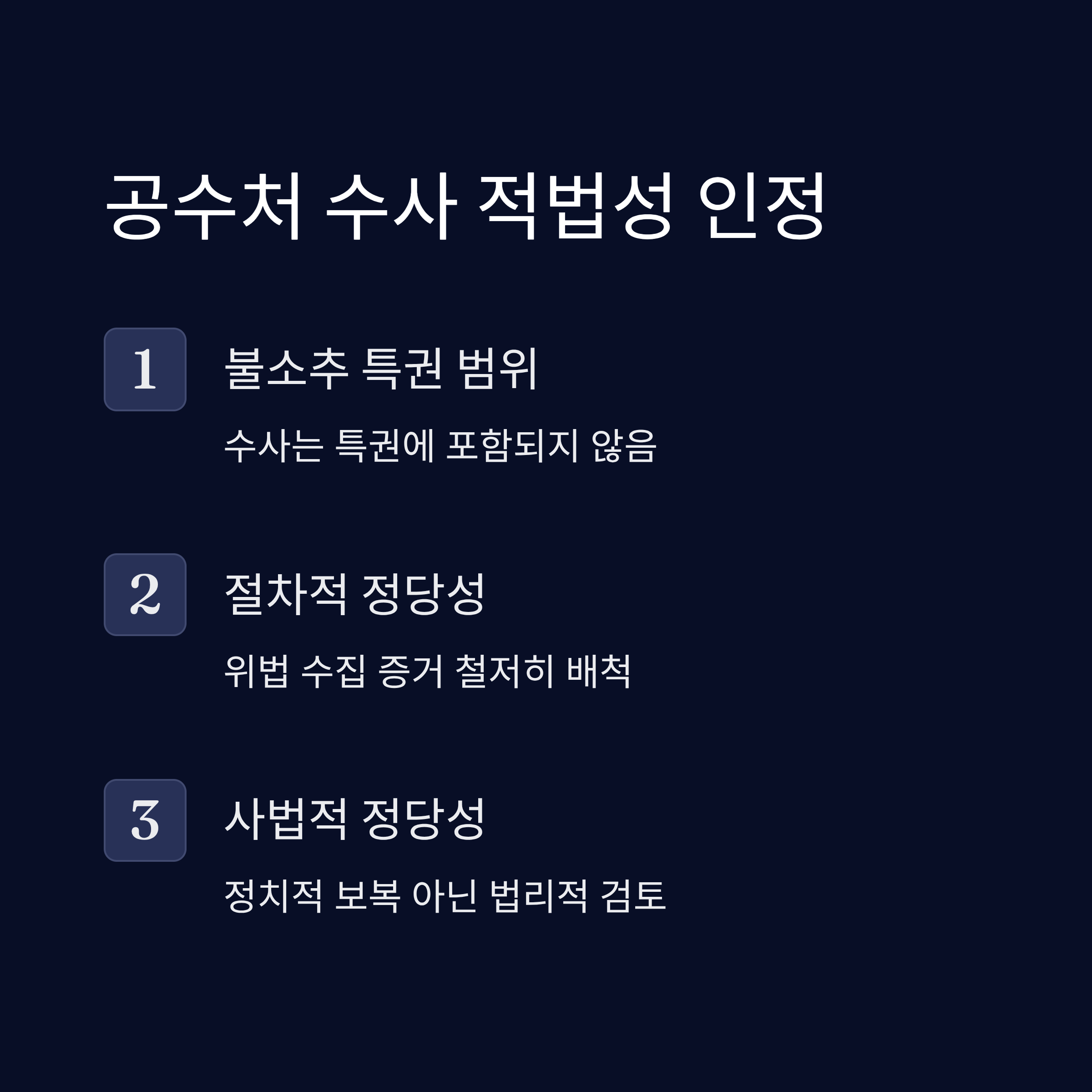 재판부는 본안 판단에 앞서 절차적 쟁점을 명확히 정리했습니다. "대통령이라도 수사 자체는 허용된다"는 대전제를 확립함으로써, 변호인 측이 주장할 수 있는 절차적 하자를 원천 봉쇄했습니다. 특히 위법 수집 증거를 철저히 배척한 것은 향후 2심, 3심에서 절차 문제로 판결이 뒤집힐 가능성을 최소화하려는 의도로 해석됩니다. 이는 이번 재판이 정치적 보복이 아닌, 엄격한 법리적 검토 위에서 이루어졌음을 강조하는 동시에 사법적 정당성을 확보하기 위한 치밀한 포석입니다.