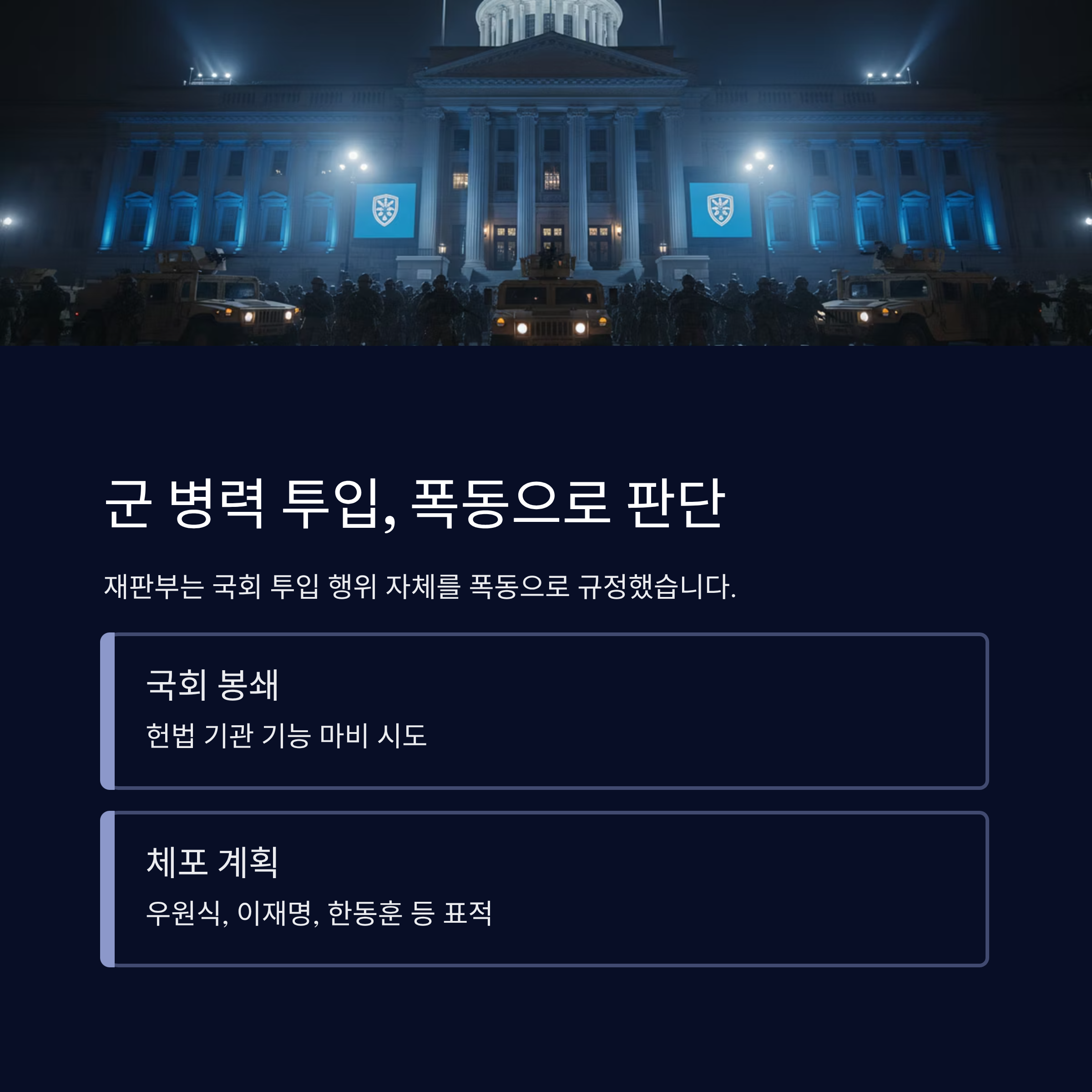 군 병력의 국회 투입 행위 자체를 '폭동'으로, 국회 봉쇄와 야당 지도부 체포 시도를 '국헌 문란의 목적'이 명백한 행위로 판단했습니다.