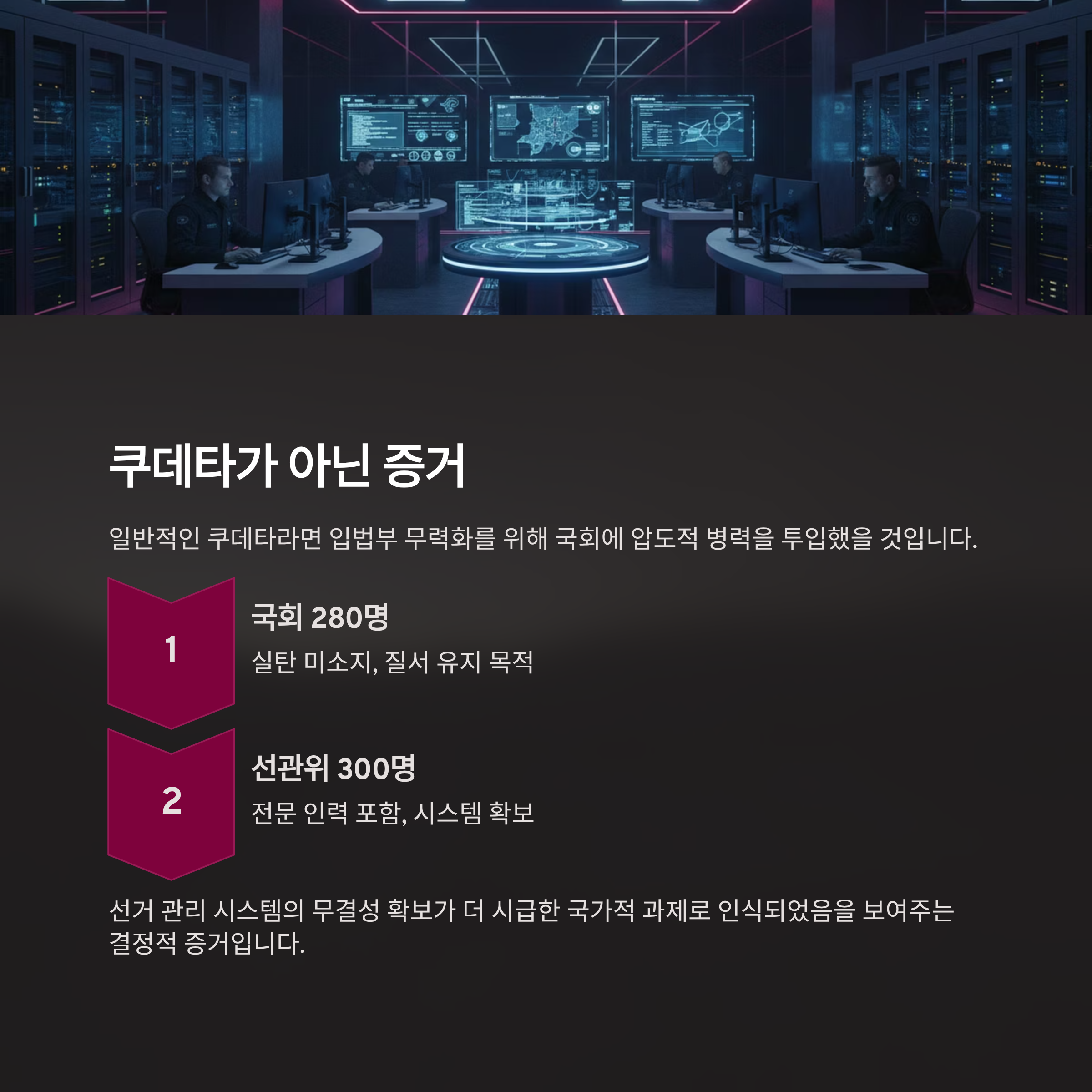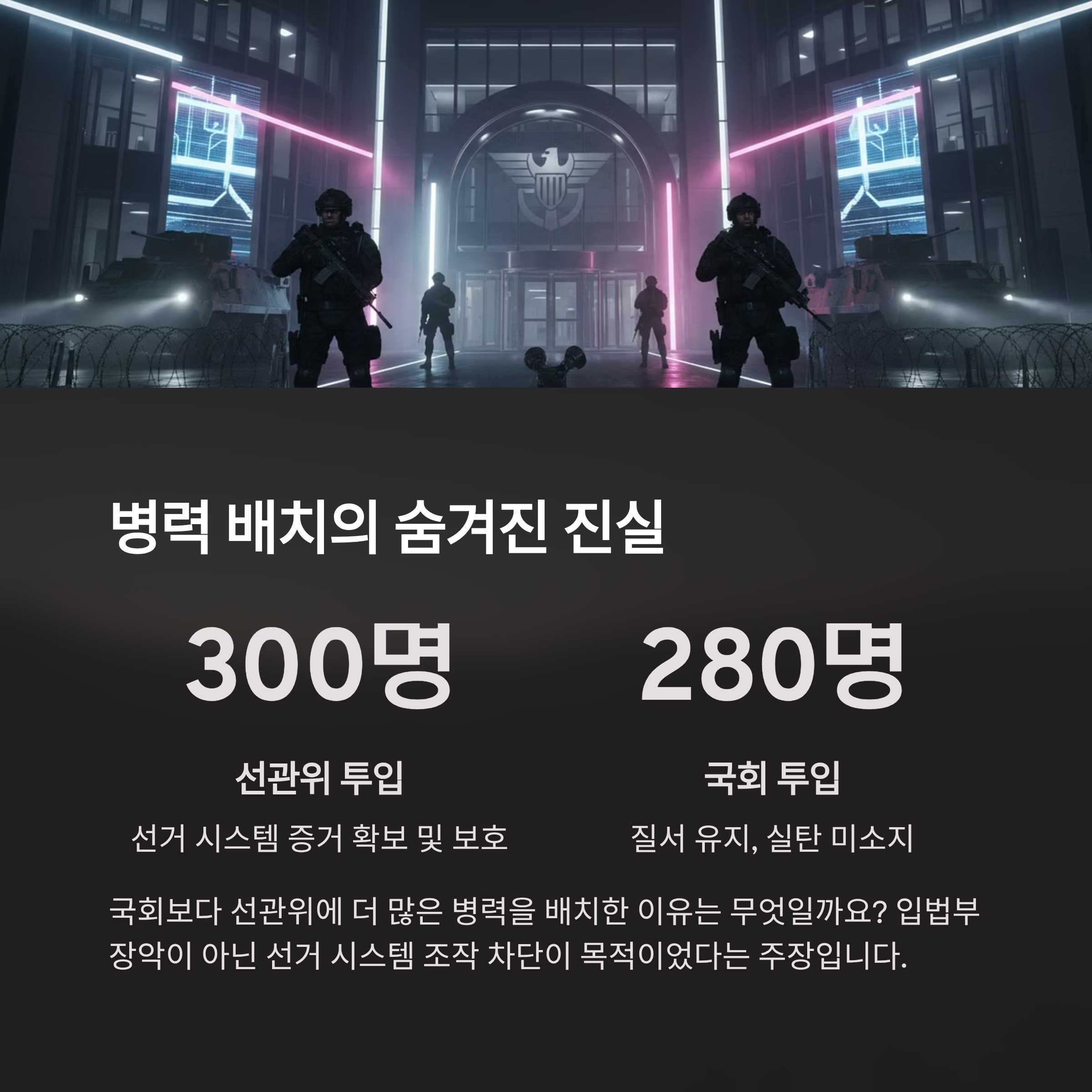 병력 배치의 의도: 국회(280명)보다 선관위(300명)에 더 많은 병력을 투입했으며, 이는 입법부 장악이 아닌 선거 시스템의 조작 가능성을 차단하고 증거를 확보하기 위함이었습니다.
