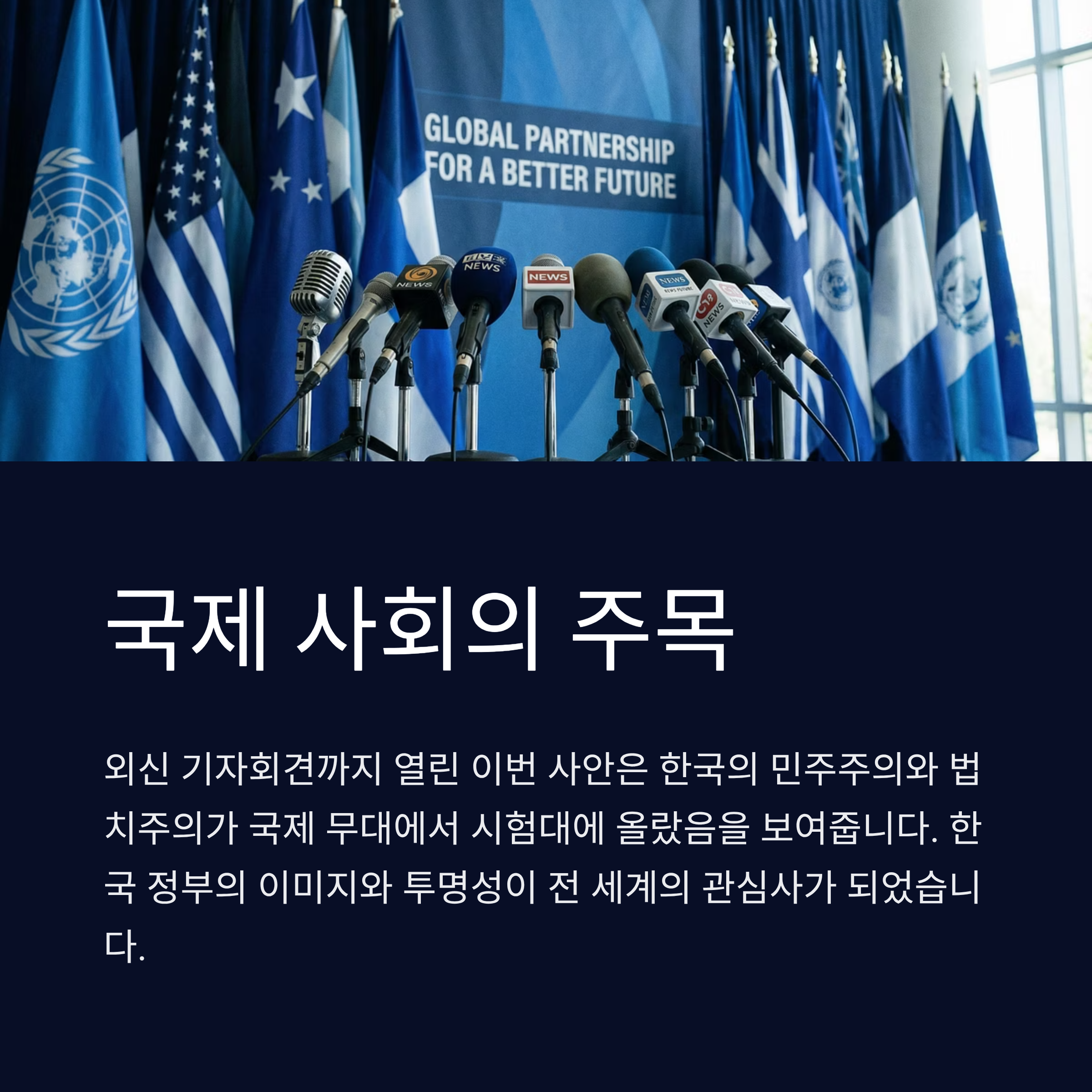 국내 정치 이슈인 윤 전 대통령 석방 건은 외신 기자회견까지 열릴 정도로 국제 사회에서도 주목받고 있습니다. 이는 대한민국의 민주주의와 법치주의 가치가 국제 무대에서 시험대에 오른 상황임을 방증합니다. 외신은 윤 전 대통령 구속의 정당성 문제와 부정부패 척결이 진정한 투명성을 발휘하고 있는지에 관심을 보이고 있으며, 이는 한국 정부의 이미지에도 영향을 줄 것으로 예상됩니다.