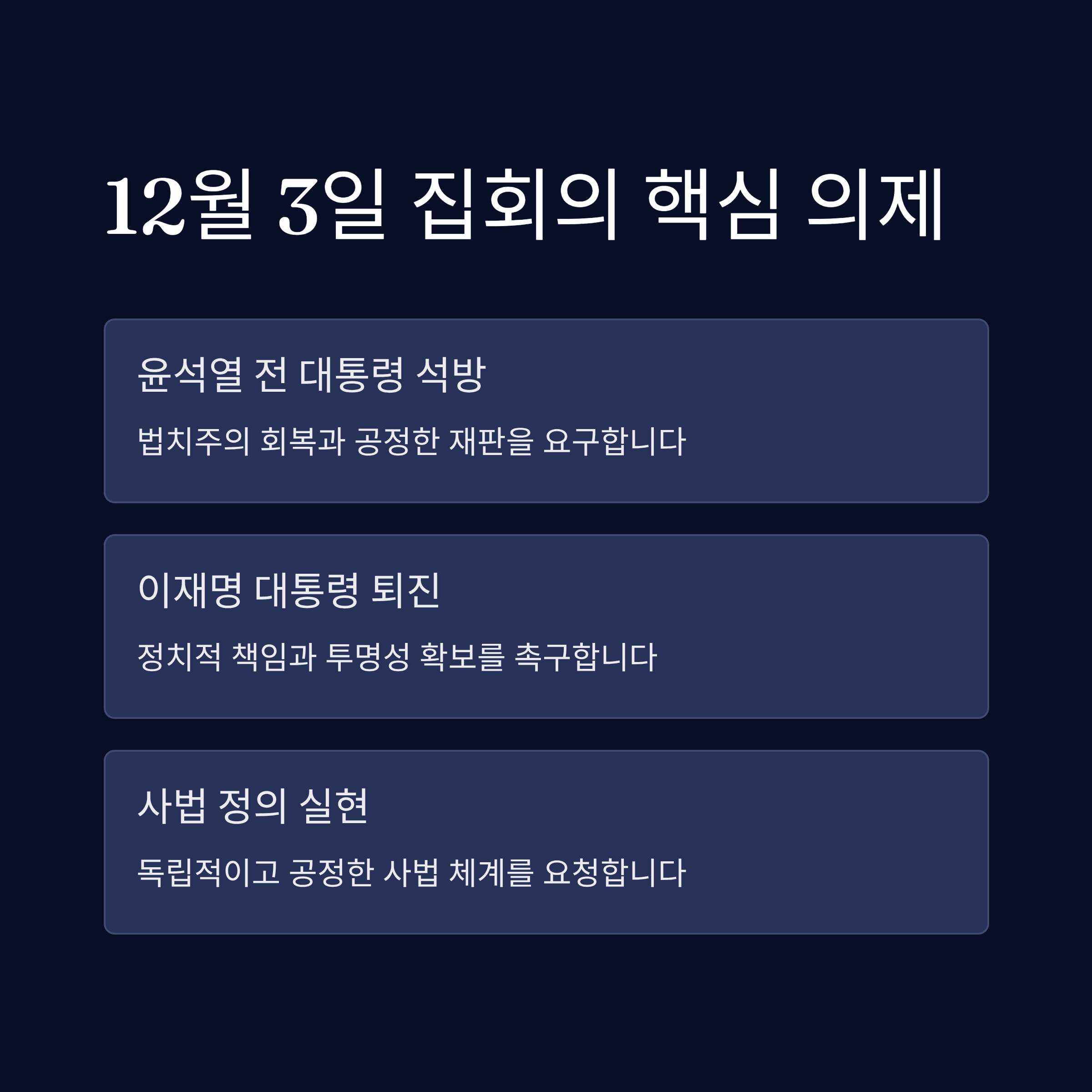 집회의 중심 아젠다는 법치 회복 및 공정 사회라는 기치를 내걸고 있습니다.