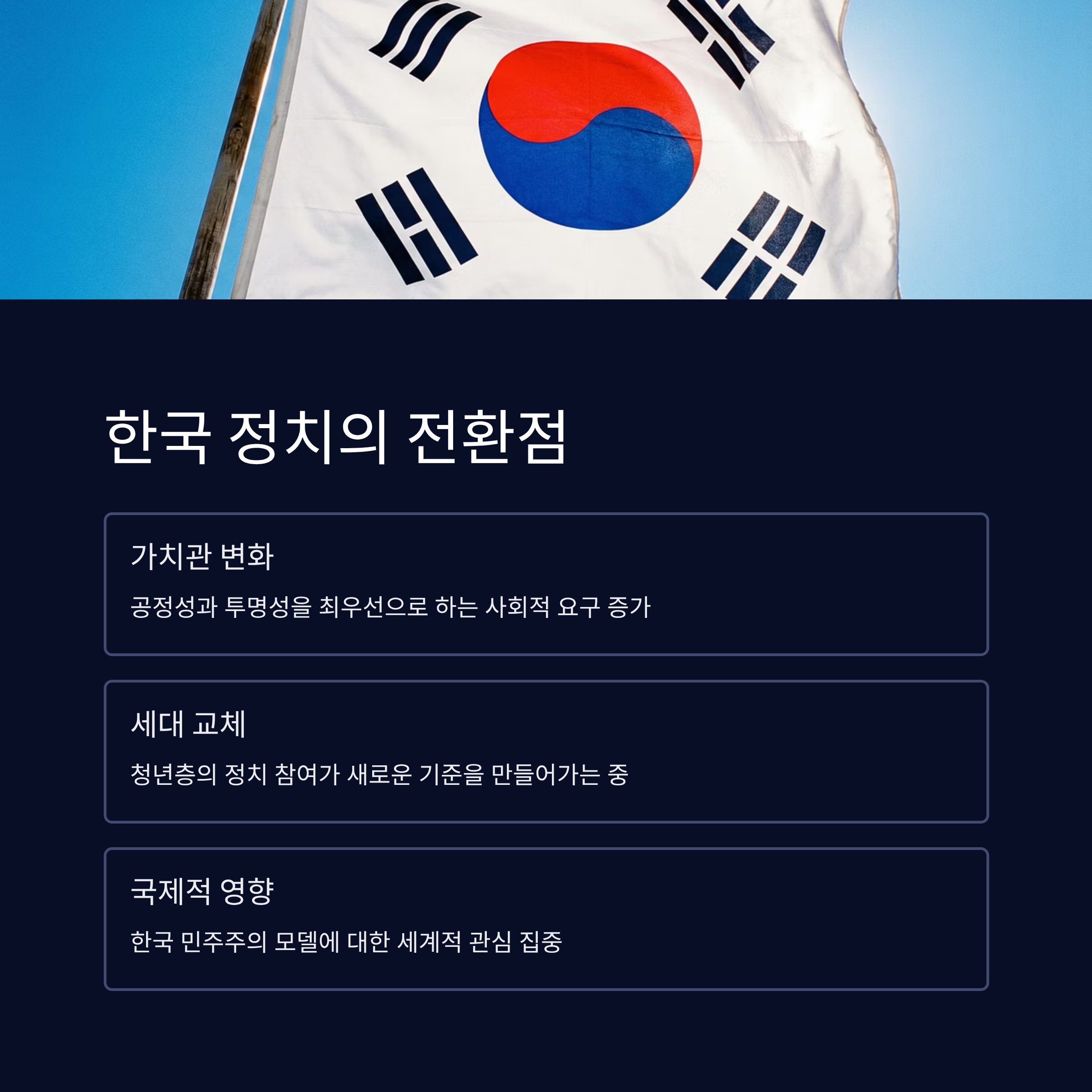 | A. 2030 세대의 정치적 각성은 미래 한국 정치의 기조를 결정하며, 공정성과 투명성을 강조하는 방향으로 여론을 이끌 가능성이 높습니다. |
