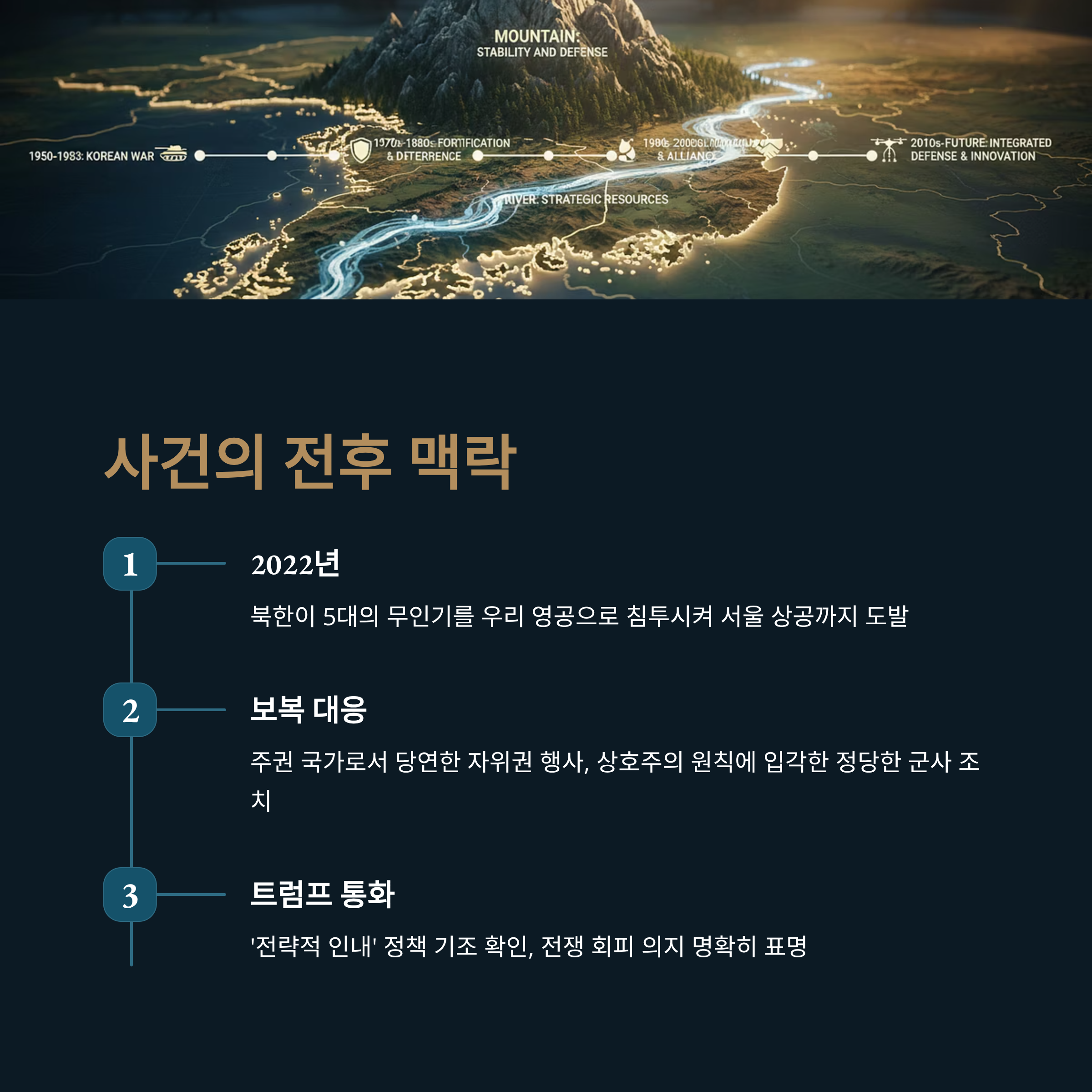 이번 '평양 무인기 침투' 사건의 본질을 이해하기 위해서는 사건의 전후 맥락을 정확히 파악해야 합니다. 특검은 이를 '의도적 도발'로 규정하지만, 당시 상황은 명백히 북한의 선제 도발에 대한 '보복 대응'이었습니다. 2022년, 북한은 5대의 무인기를 우리 영공으로 침투시켜 서울 상공까지 휘젓고 다니는 심각한 도발을 감행했습니다. 이는 과거 연평도 포격 도발과 같이 대한민국의 주권을 명백히 침해한 군사적 위협 행위였습니다. 이에 대한 우리 군의 무인기 맞대응은 주권 국가로서 당연히 행사해야 할 자위권의 일환이며, 상호주의 원칙에 입각한 정당한 군사적 조치였습니다.