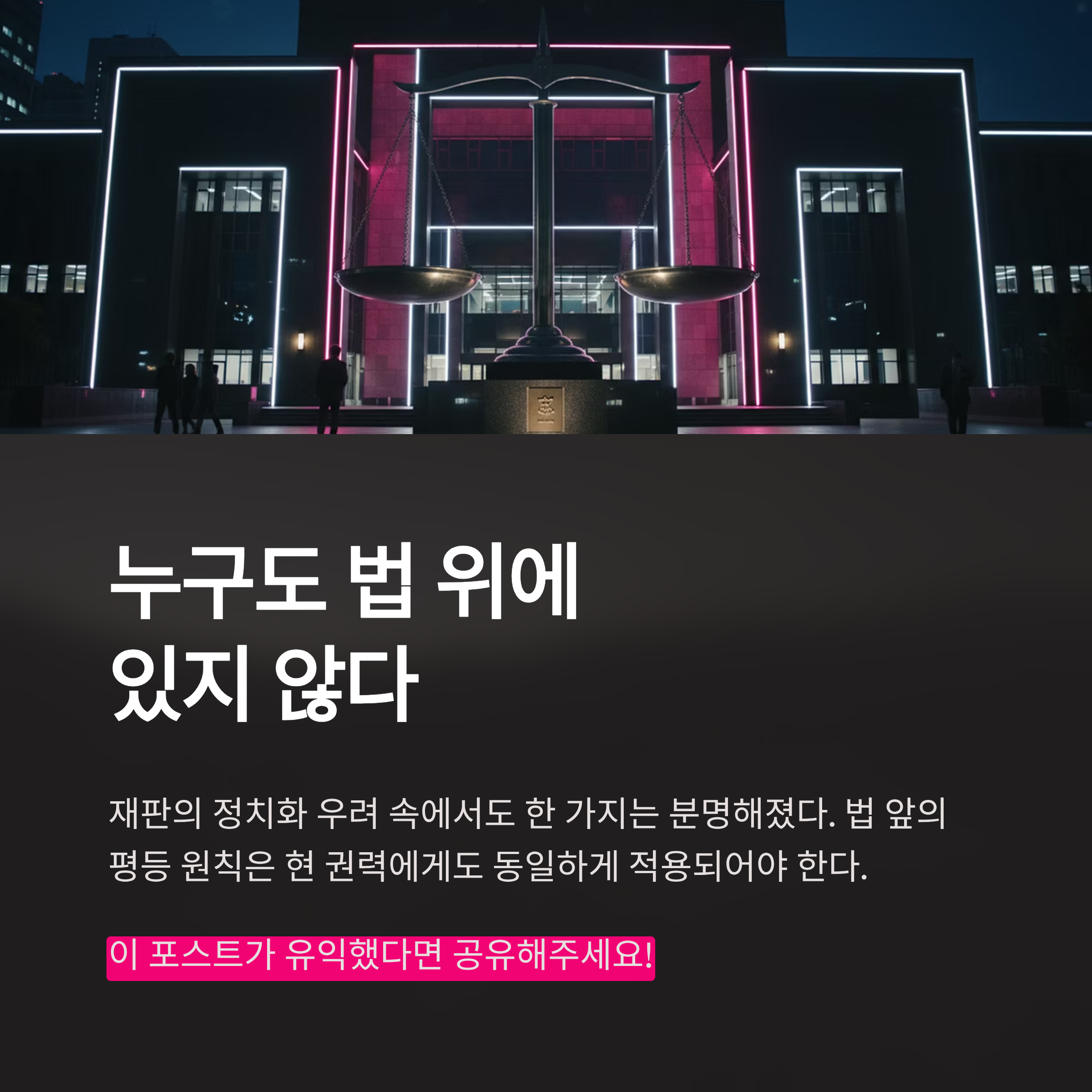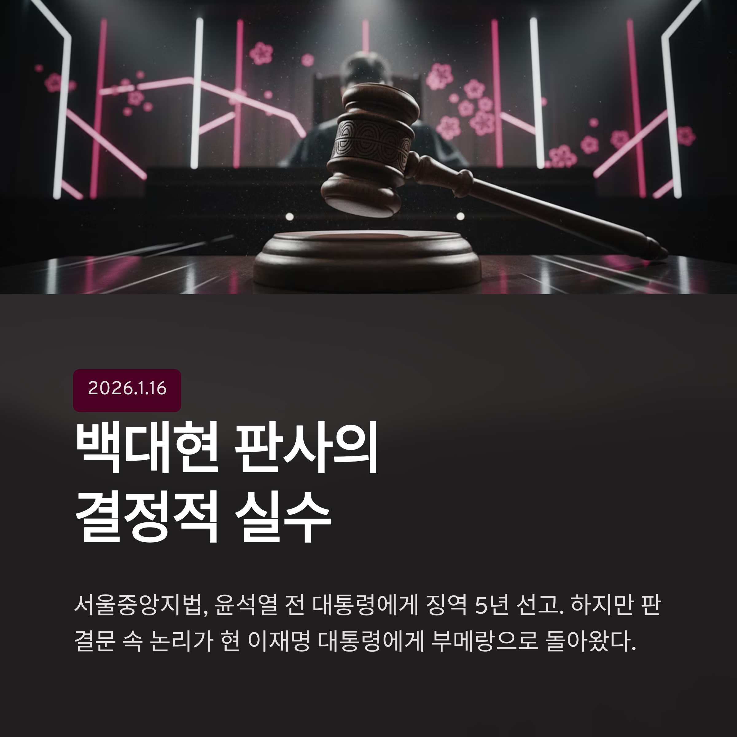 백대현 부장판사의 윤석열 전 대통령에 대한 징역 5년 선고는 사법적 정의 실현이라는 명분 아래 이루어졌으나, 그 과정과 법리 해석은 정치적 논란을 야기하고 있습니다. 특히 대통령의 불소추 특권을 좁게 해석하여 수사 가능성을 열어둔 것은, 현재 다수의 사법 리스크를 안고 있는 이재명 대통령에게 즉각적인 위협으로 되돌아왔습니다. 재판이 정치가 되어서는 안 된다는 법조계의 우려 속에서, 이번 판결은 오히려 '누구도 법 위에 있지 않다'는 원칙이 현 권력인 이재명 대통령에게도 동일하게 적용되어야 함을 역설적으로 증명했습니다. 국민들은 2월 19일 이어질 내란 혐의 재판이 정치적 외압 없이 오직 법과 양심에 따라 진행될지 날카롭게 지켜볼 것입니다.