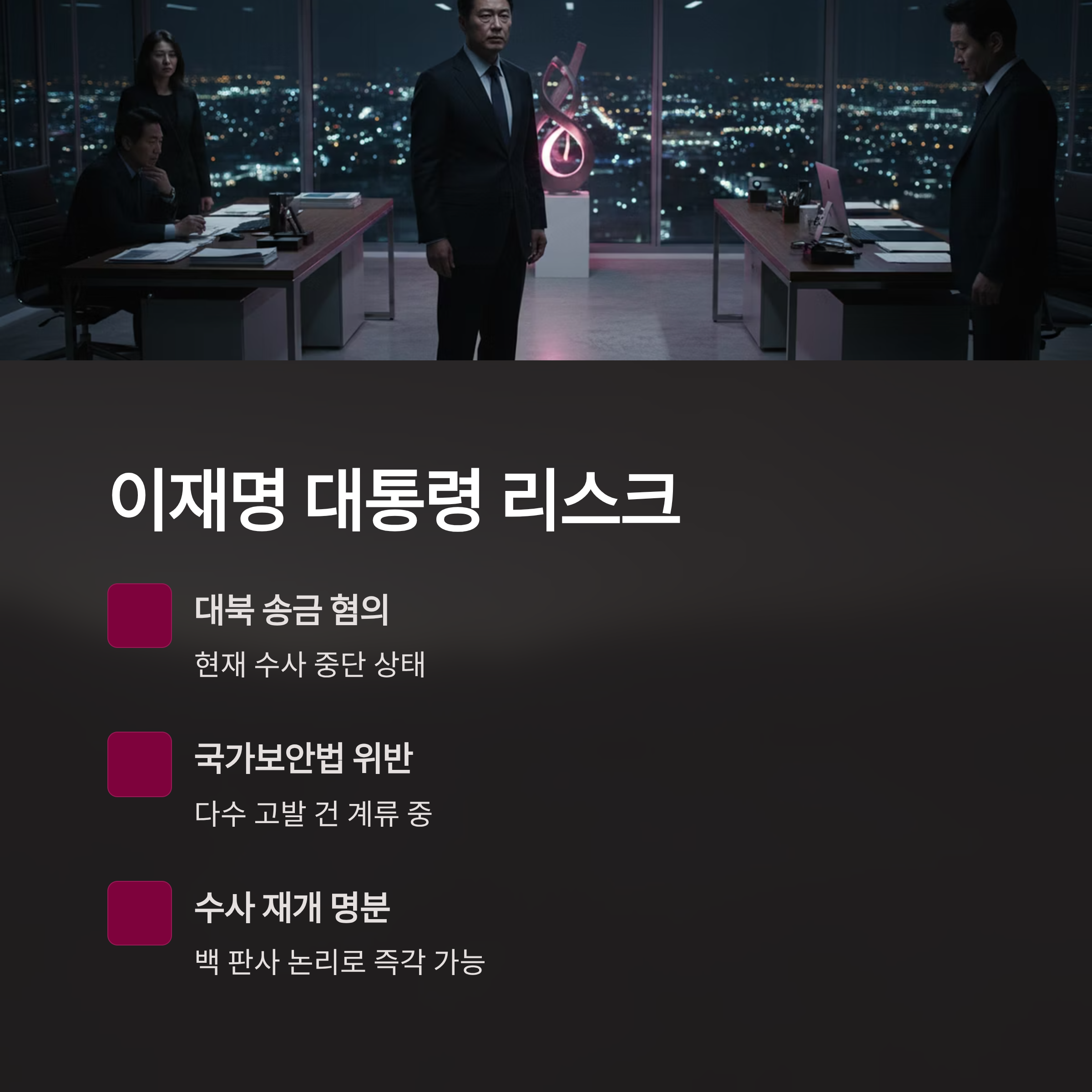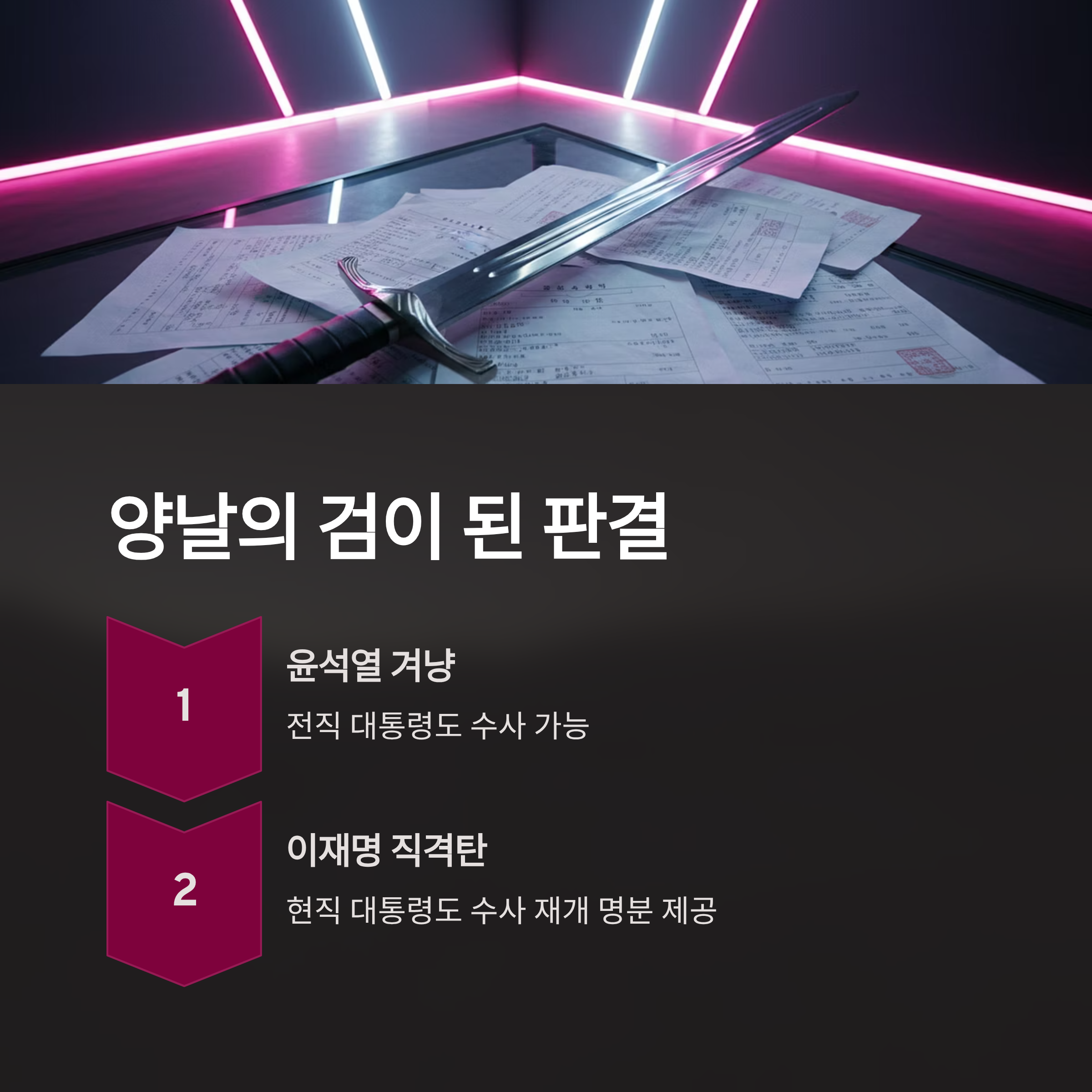 법리적 역설 (이재명 리스크): 재판부는 헌법 제84조가 대통령의 '재직 중 형사 소추(기소)'를 금지할 뿐, '수사' 자체를 제한하지 않는다고 판시했습니다. 이 논리대로라면 대북 송금 등의 혐의를 받는 이재명 대통령도 멈춰진 수사를 즉각 재개해야 한다는 부메랑 효과가 발생합니다.