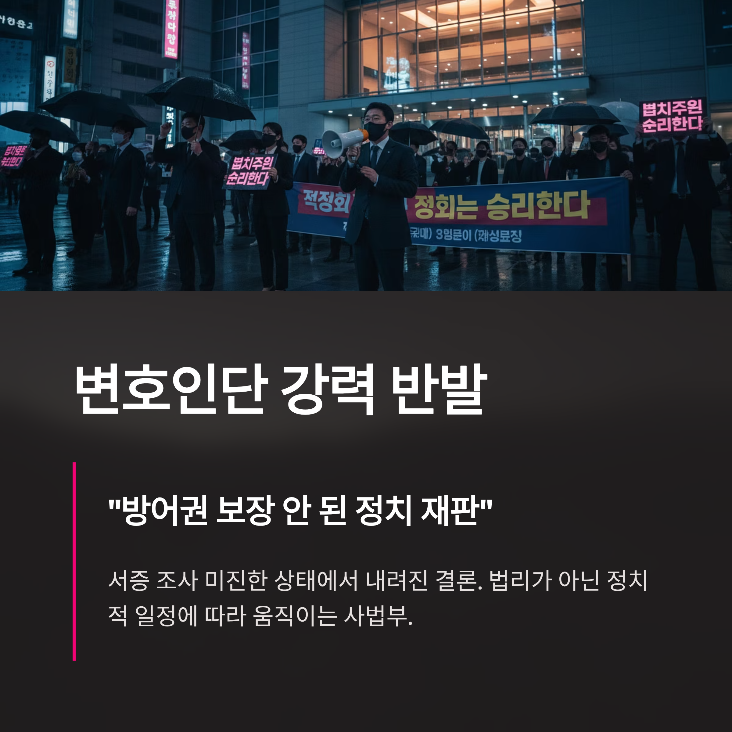 변호인단 반발: 방어권이 보장되지 않은 '정치 재판'으로 규정하며 강력 비판했습니다.