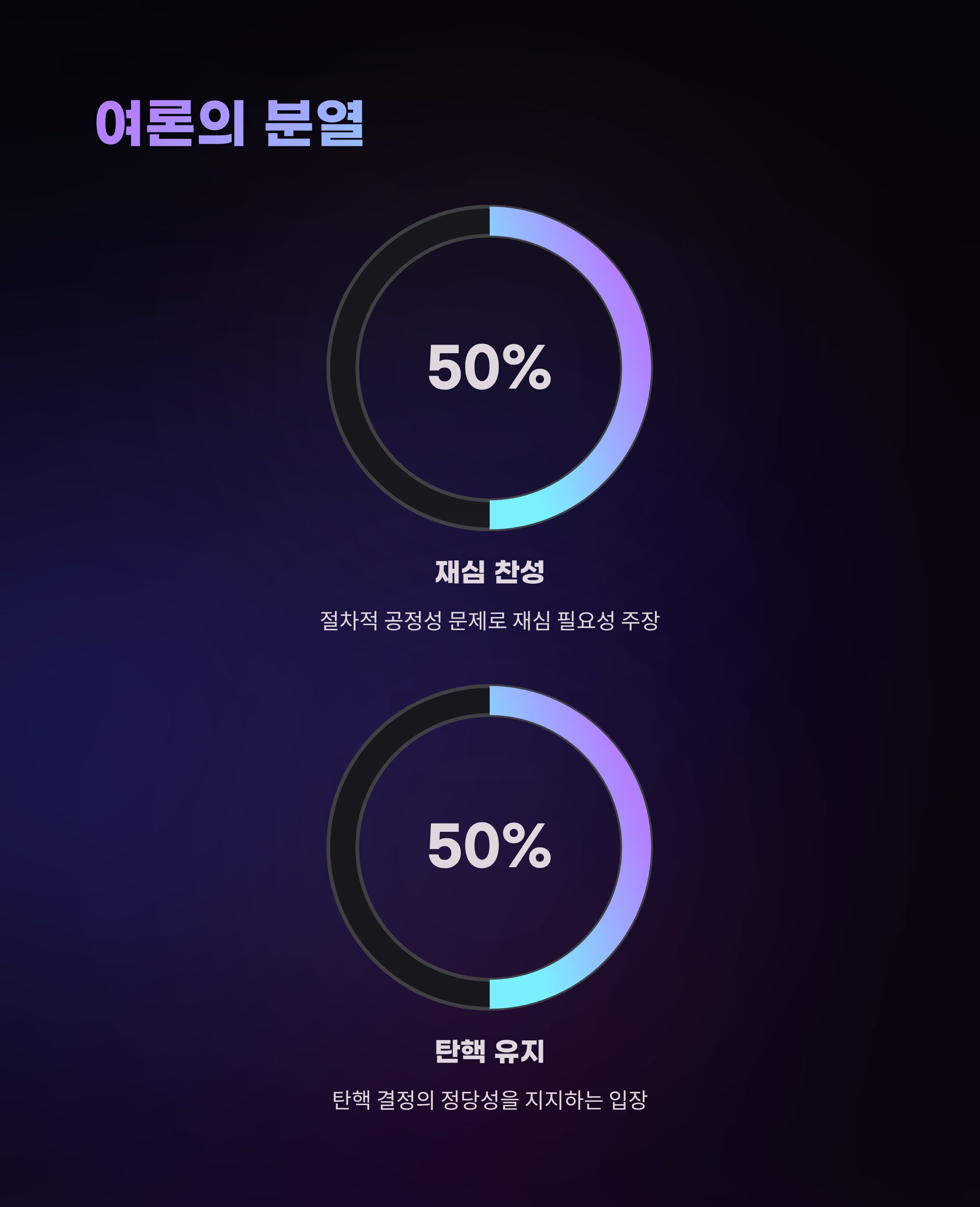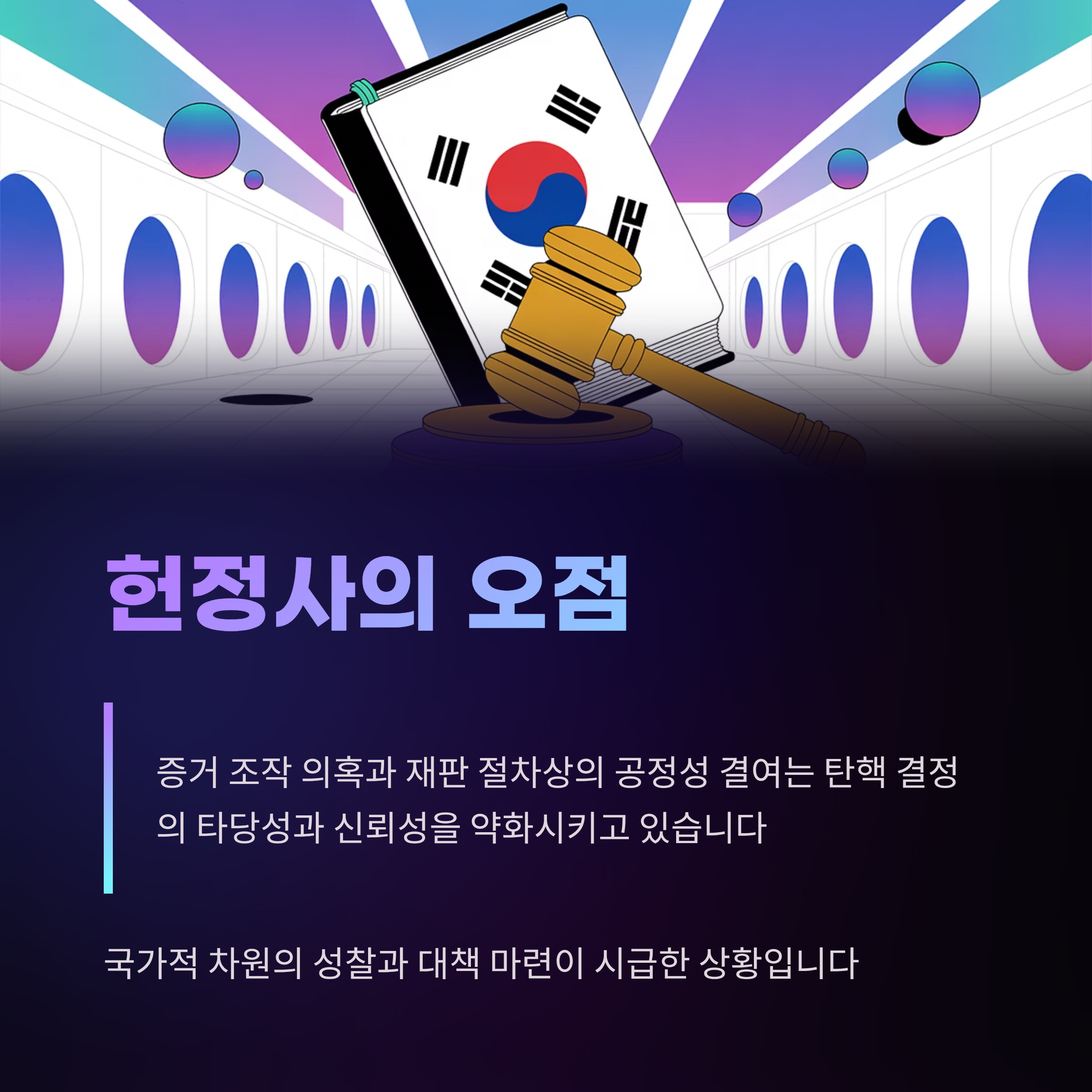 헌법적 절차에 필수적인 공정성이 문제시되며, 국민 여론은 크게 두 갈래로 갈라지고 있습니다.