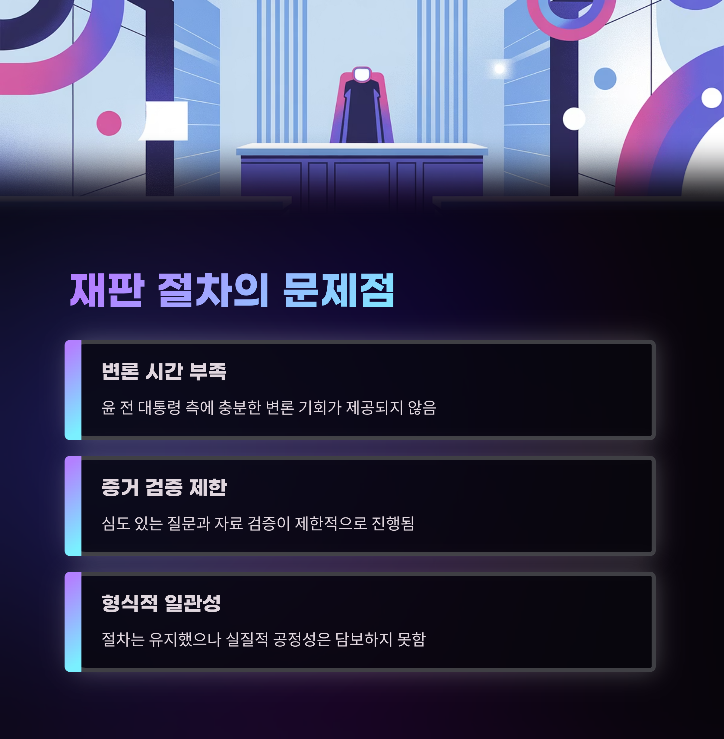 | A. 증거 검증 부족, 시간 제한으로 인한 충분한 변론 기회 부족 등 여러 절차적 문제가 지적되었습니다. 이는 재판 공정성을 훼손하는 요소로 평가받고 있습니다. |