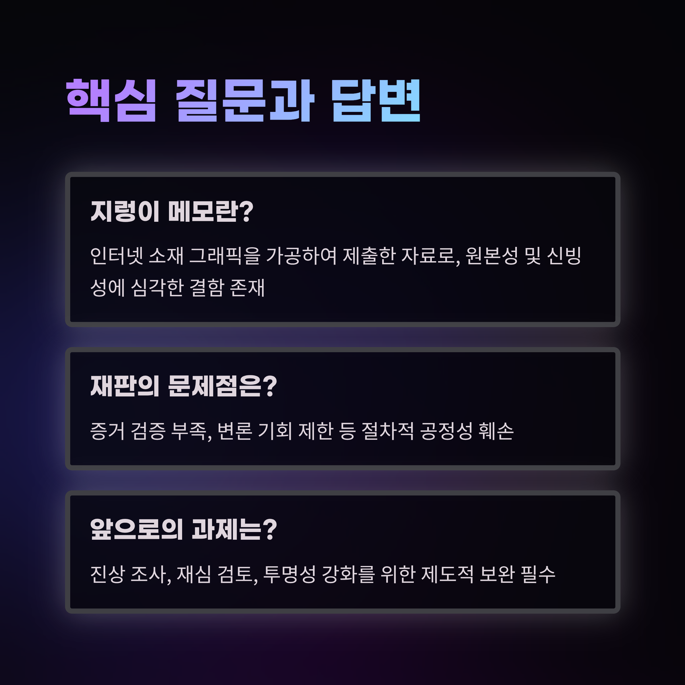 지렁이 메모는 윤석열 전 대통령 탄핵 재판의 주요 증거 중 하나였습니다. 하지만 홍장원 전 국정원 차장의 증언에 따르면 이 메모는 본래 작성된 문서가 아닌, 인터넷에서 내려받은 이미지를 편집하여 제출된 것으로 드러났습니다. 이는 단순 실수로 보기 어렵고, 재판 절차의 신뢰를 낮추는 중대한 문제로 평가됩니다. 특히 이러한 조작 행위는 탄핵의 정당성을 기반으로 신뢰받아야 할 법적 근거를 약화시키며, 국민 신뢰 또한 크게 흔들리게 합니다.