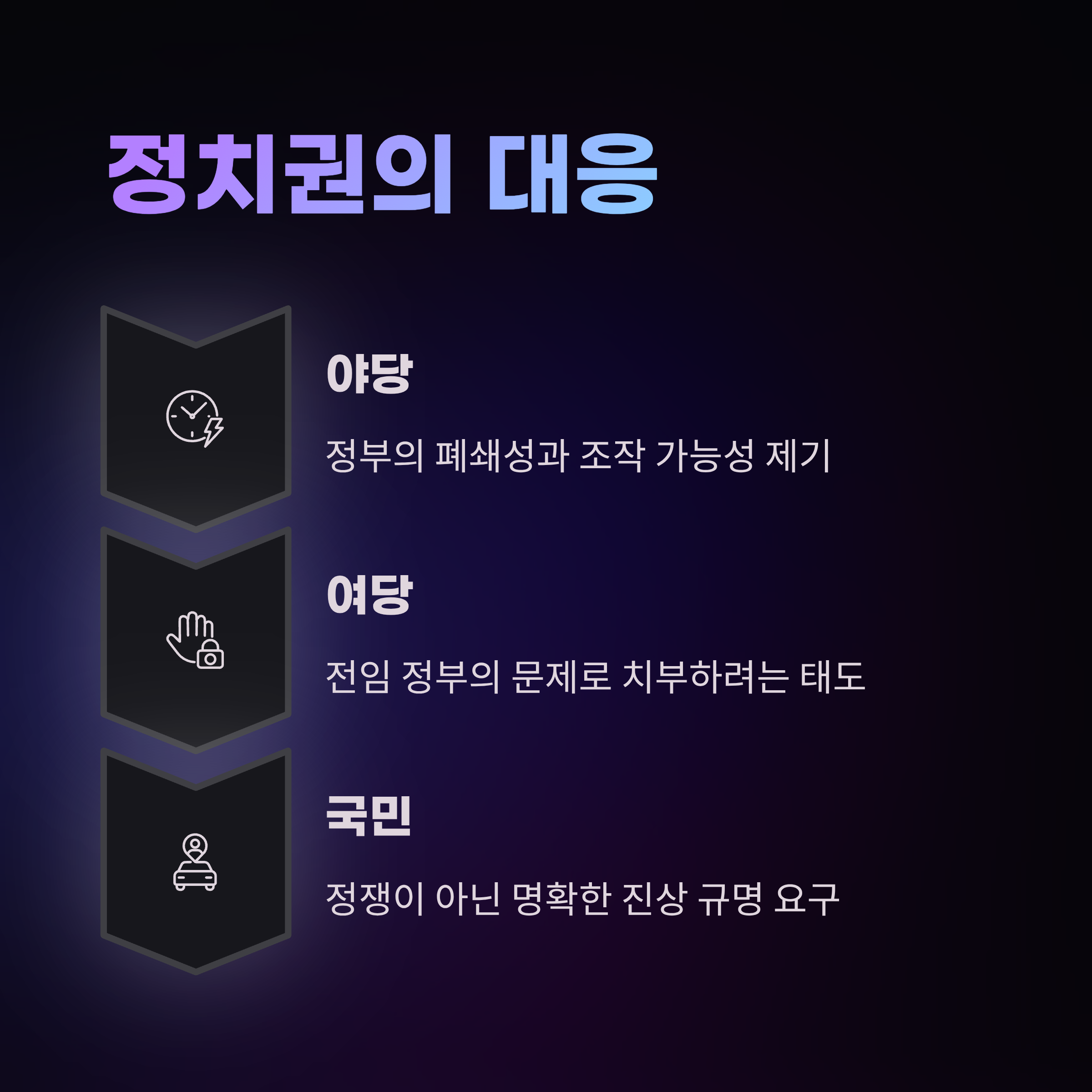 탄핵 논란이 지속되면서 정치권에서도 책임 소재와 관련된 논쟁이 격화되는 모습입니다. 야당은 이 사건을 근거로 정부의 폐쇄성과 조작 가능성을 제기하는 한편, 여당은 이를 전임 정부의 문제로 치부하려는 태도를 보이고 있습니다. 그러나 국민들이 원하는 것은 정쟁이 아닌, 명확한 진상 규명과 책임자 처벌입니다. 이를 해결하지 않는다면 탄핵 법칙 및 헌정 질서의 위기라는 더 큰 파장을 불러올 가능성도 존재합니다.