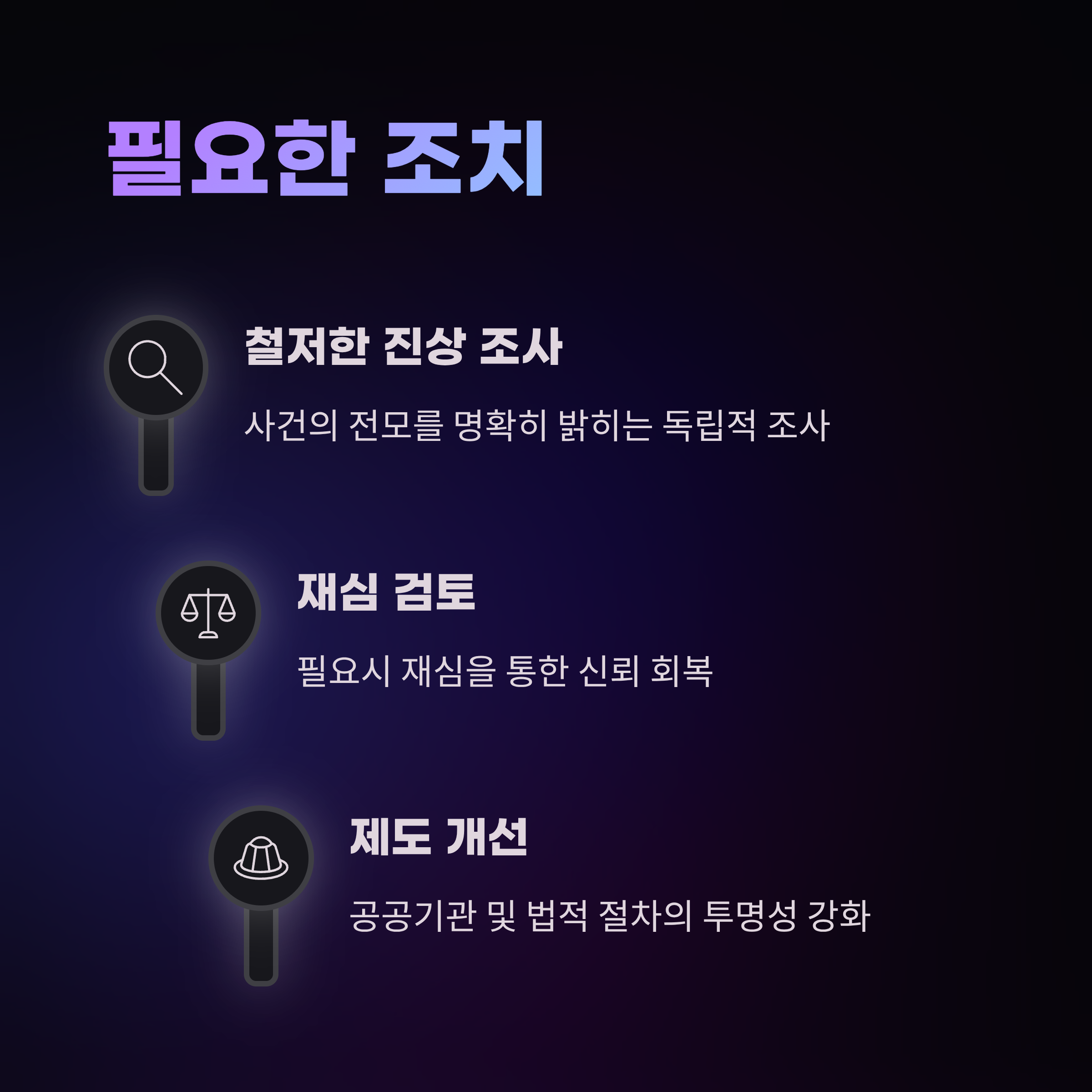| A. 사건의 진상을 철저히 조사하고, 필요시 재심을 통해 신뢰를 회복해야 합니다. 아울러, 모든 공공기관 및 법적 절차의 투명성 강화를 위한 제도적 보완도 필수적입니다. |