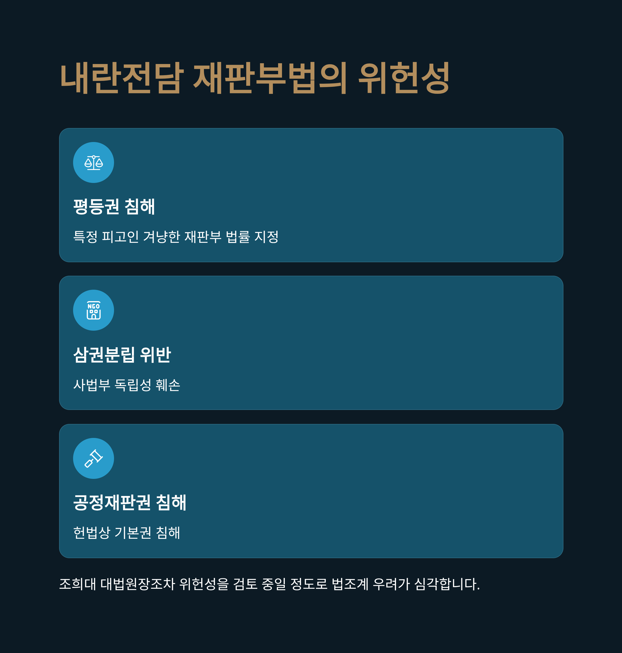 민주당 등 야당이 강행 처리한 '내란전담 재판부법'은 특정 피고인을 겨냥해 재판부를 법률로 지정한다는 점에서 위헌 논란을 피할 수 없습니다. 헌법은 모든 국민에게 공정한 재판을 받을 권리와 법관에 의한 재판을 받을 권리를 보장하고 있습니다. 윤 전 대통령 측 변호인단은 이미 이 법안이 헌법상 평등권과 삼권분립 원칙을 침해한다며 위헌법률심판 제청을 예고했습니다. 조희대 대법원장조차 이 법안의 위헌성을 검토 중일 정도로 법조계의 우려는 심각합니다.