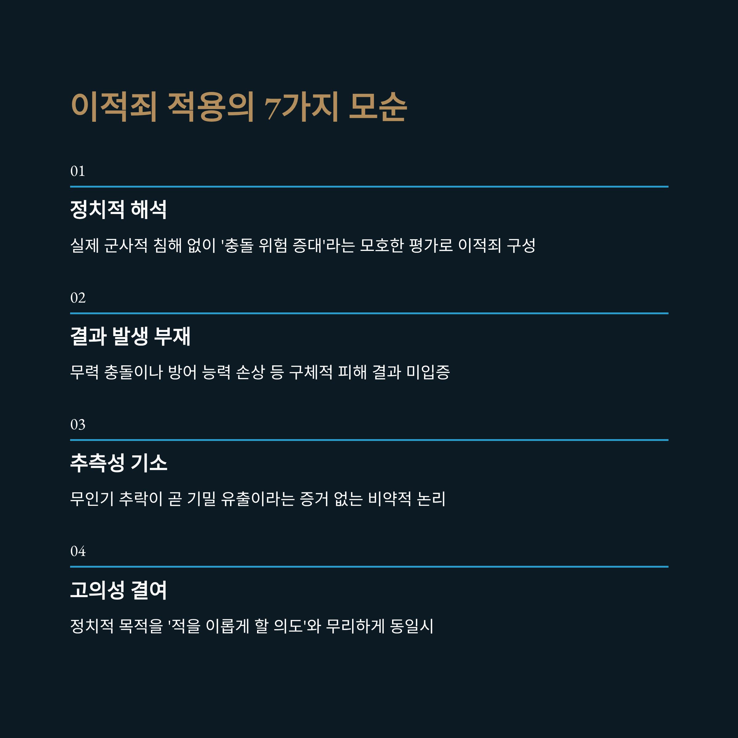 | 3. 추측성 기소 | 무인기 추락이 곧 기밀 유출이라는, 증거 없는 비약적 '2단 점프' 논리. |