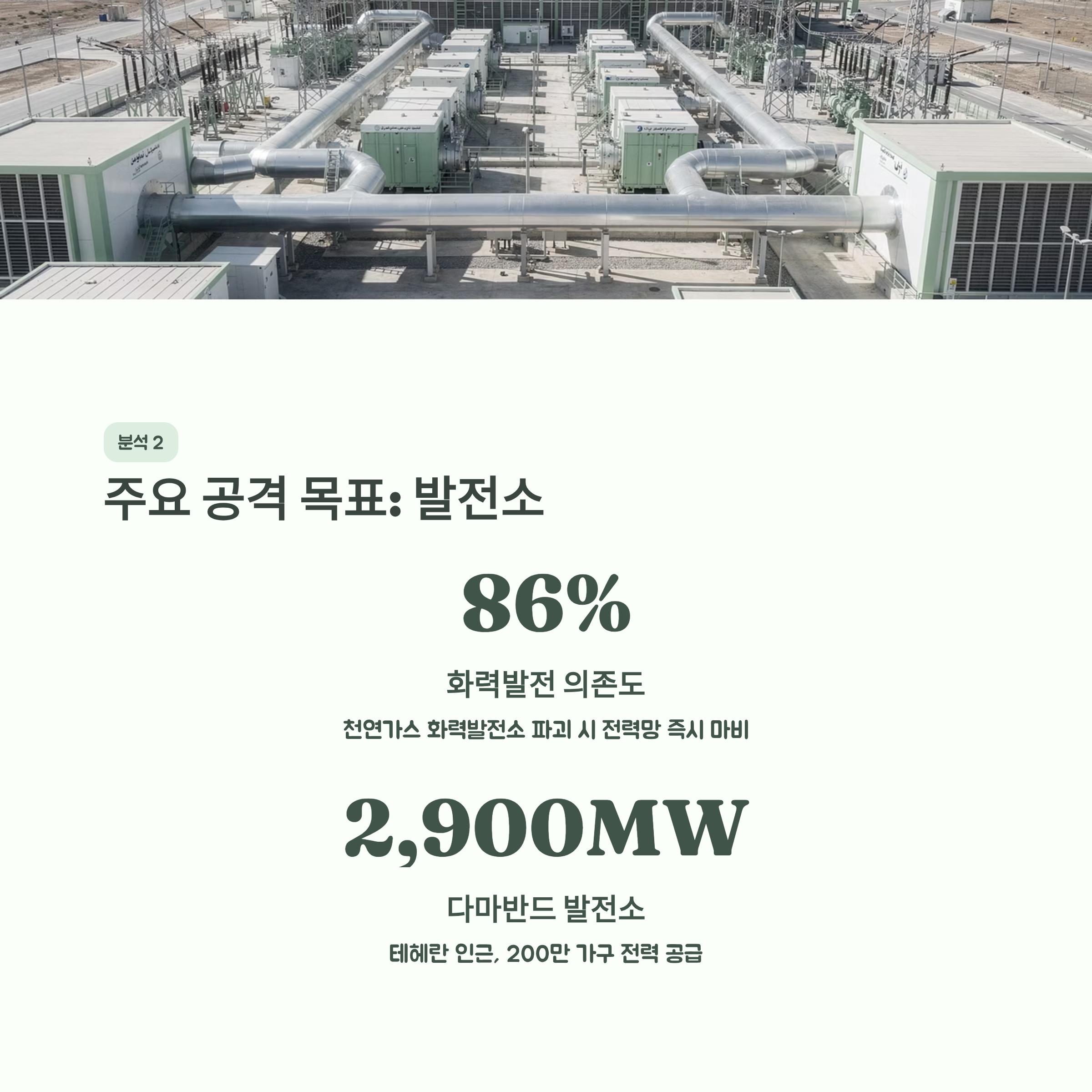 | A. 이란의 전력 공급을 책임지는 발전소와 물류의 핵심인 교량 등 사회 핵심 기반 시설을 파괴하여, 국가 시스템을 마비시키고 현대 문명 이전의 상태로 되돌리겠다는 극단적인 공격 위협입니다. |