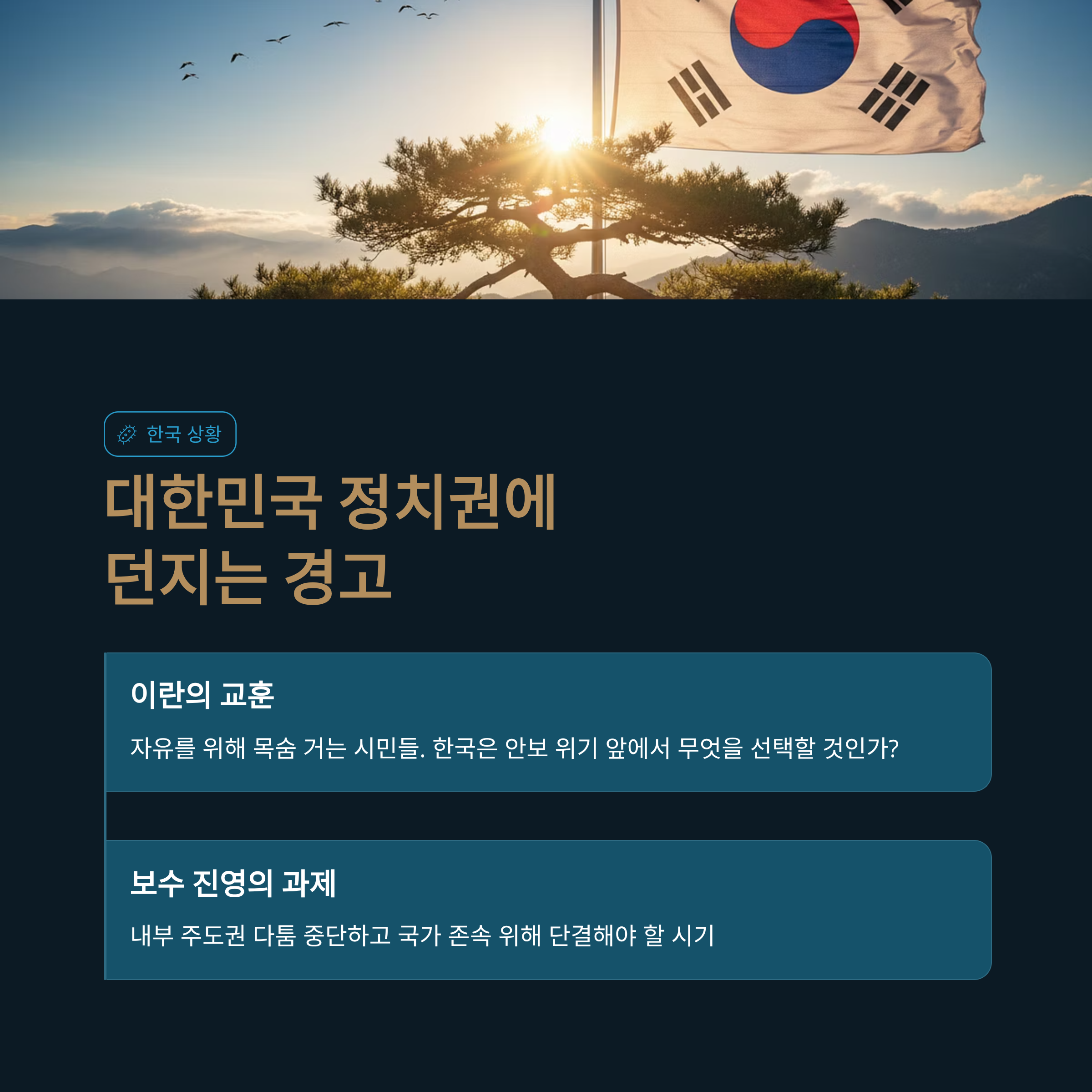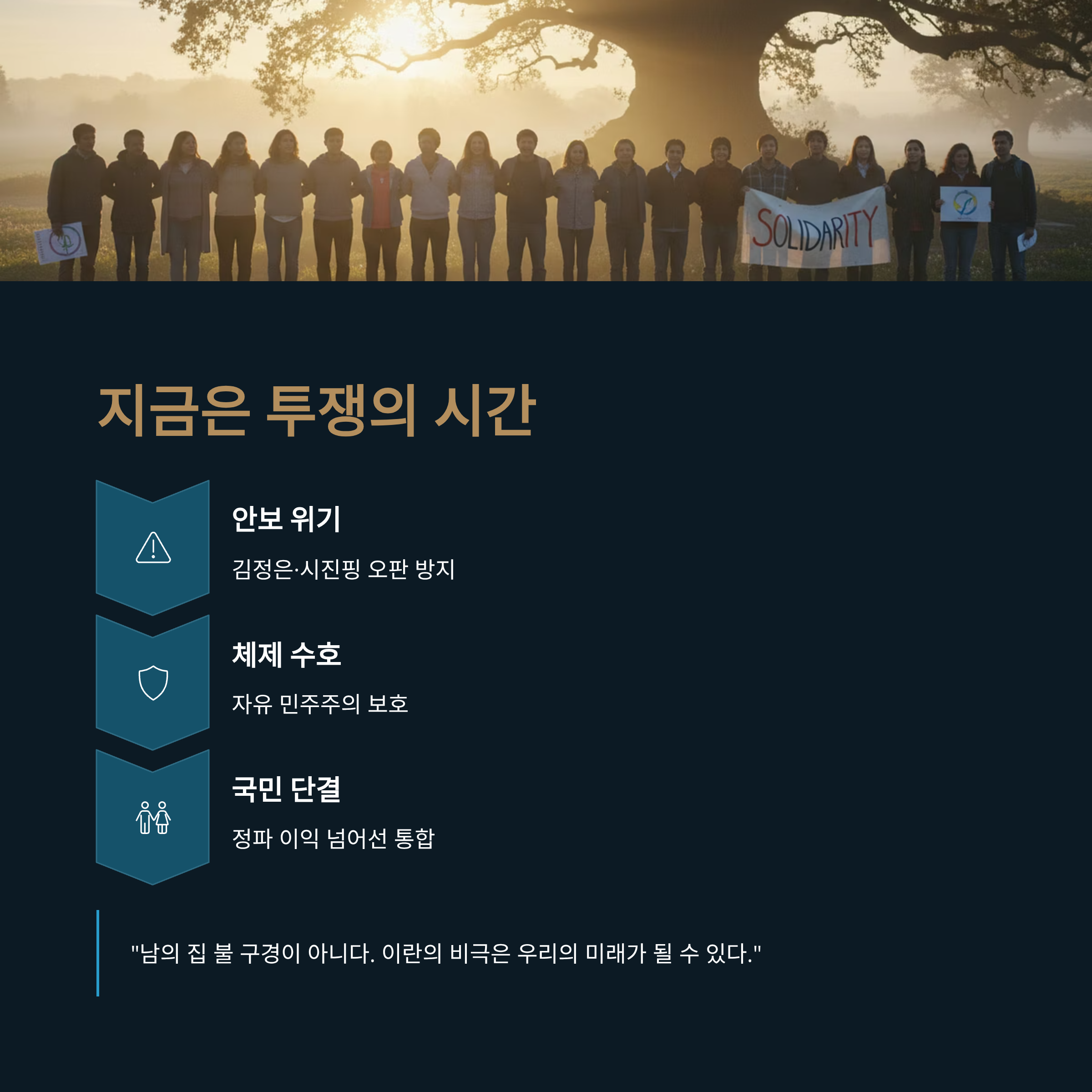 | A. 이란 국민들이 목숨을 걸고 자유를 외치는 상황에서, 한국의 보수 진영이 내부 권력 다툼에만 몰두해서는 안 된다는 경고입니다. 국가의 안위가 위협받는 상황에서 정파적 이익보다 국가의 존속과 자유 민주주의 수호를 위해 단결해야 함을 강조하고 있습니다. |