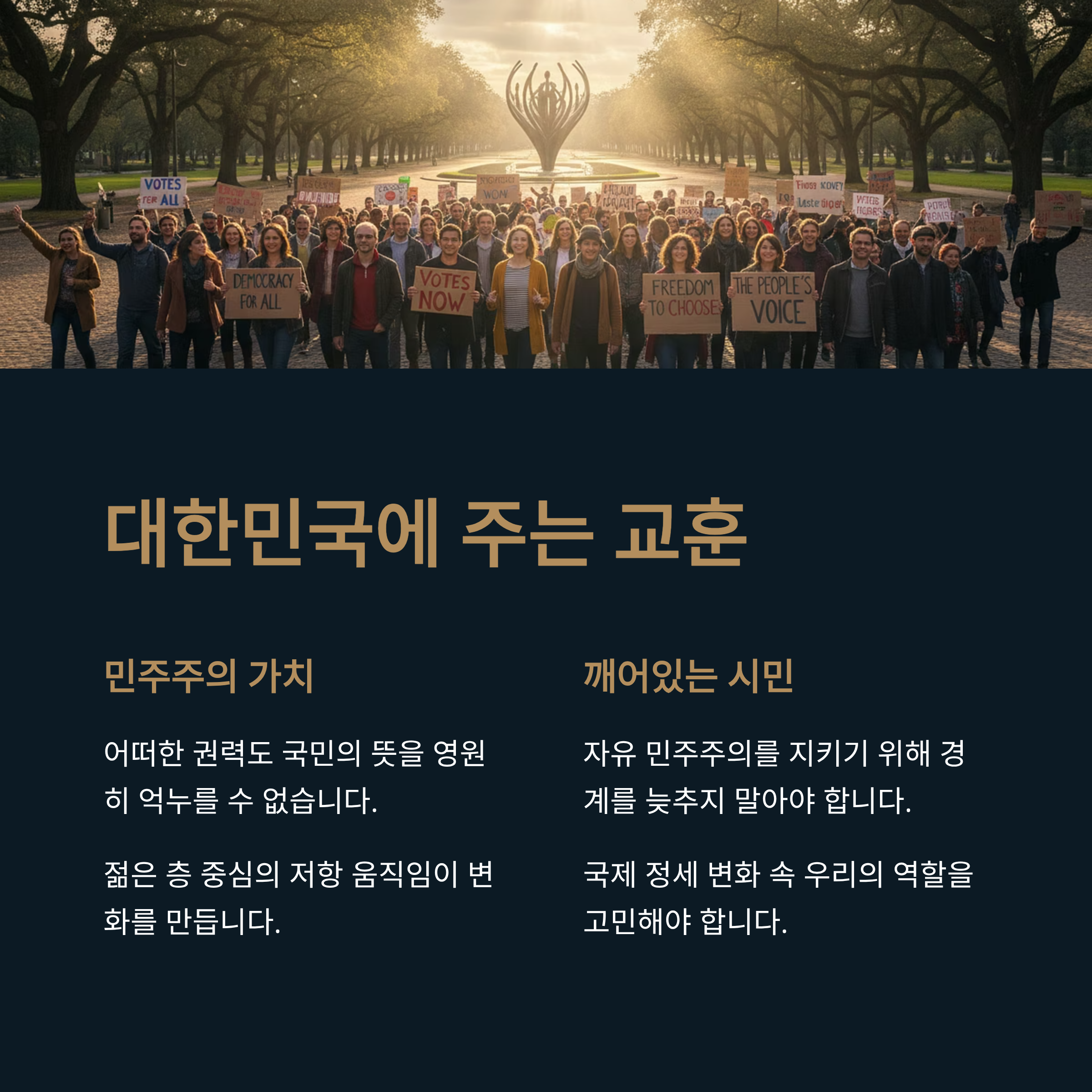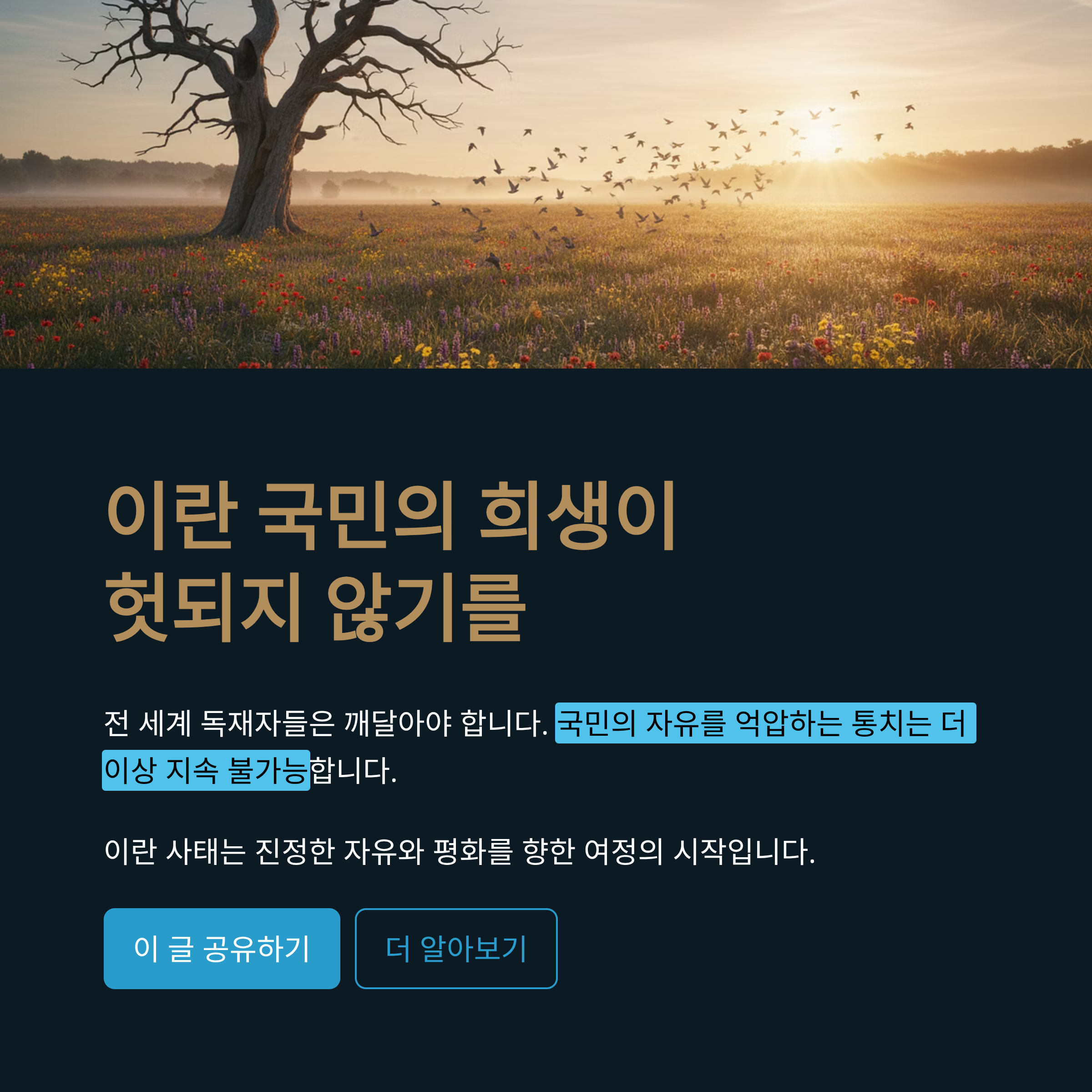 이번 사태는 전 세계 독재자들에게 보내는 강력한 경고 메시지입니다. 중국, 러시아, 북한 등 권위주의 국가들은 국민의 자유를 억압하는 통치 방식이 더 이상 지속 가능하지 않음을 깨달아야 합니다. 또한 대한민국 역시 이러한 국제 정세의 변화 속에서 자유 민주주의의 가치를 지키기 위해 깨어 있어야 합니다. 이란 국민들의 희생이 헛되지 않고 진정한 자유와 평화로 이어지기를 기대합니다.
