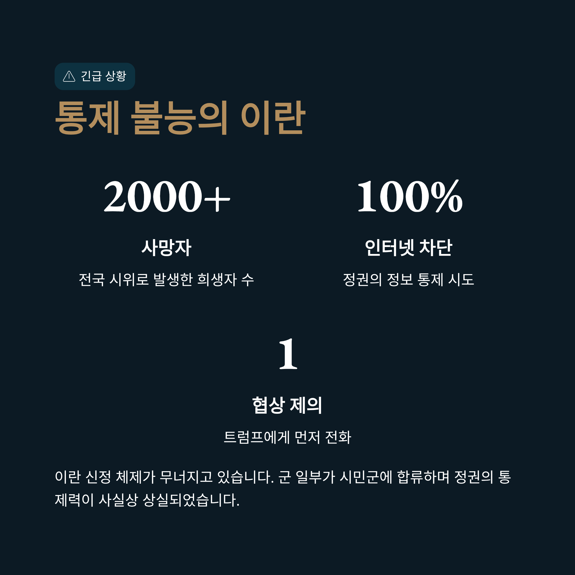 통제 불능의 내부 상황: 이란 전역으로 확산된 시위로 2,000명 이상의 사망자가 발생했으며, 군 일부가 시민군에 합류하는 등 정권의 통제력이 사실상 상실되었습니다.