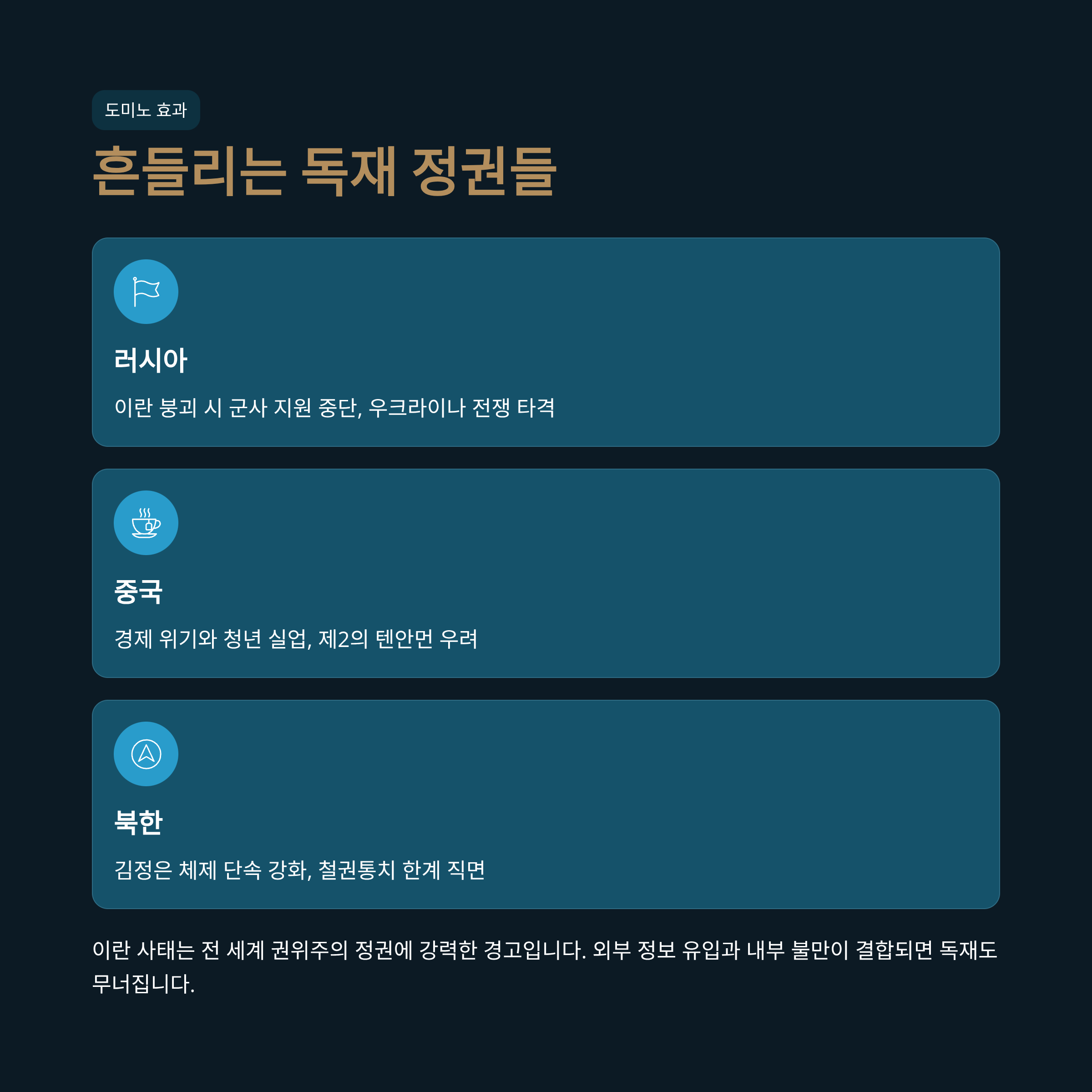 이란 사태는 단순히 중동의 문제로 끝나지 않고 전 세계 권위주의 정권에 '도미노 효과'를 불러일으킬 가능성이 큽니다. 이란의 붕괴는 곧 러시아에 대한 군사 지원 중단을 의미하며, 이는 우크라이나 전쟁에서 고전 중인 푸틴 정권에 타격을 줄 것입니다. 중국 역시 경제 위기와 청년 실업률 증가로 내부 불만이 고조된 상황에서, 제2의 텐안먼(천안문) 사태가 발생할 수 있다는 우려 속에 이란 사태를 예의주시하고 있습니다.