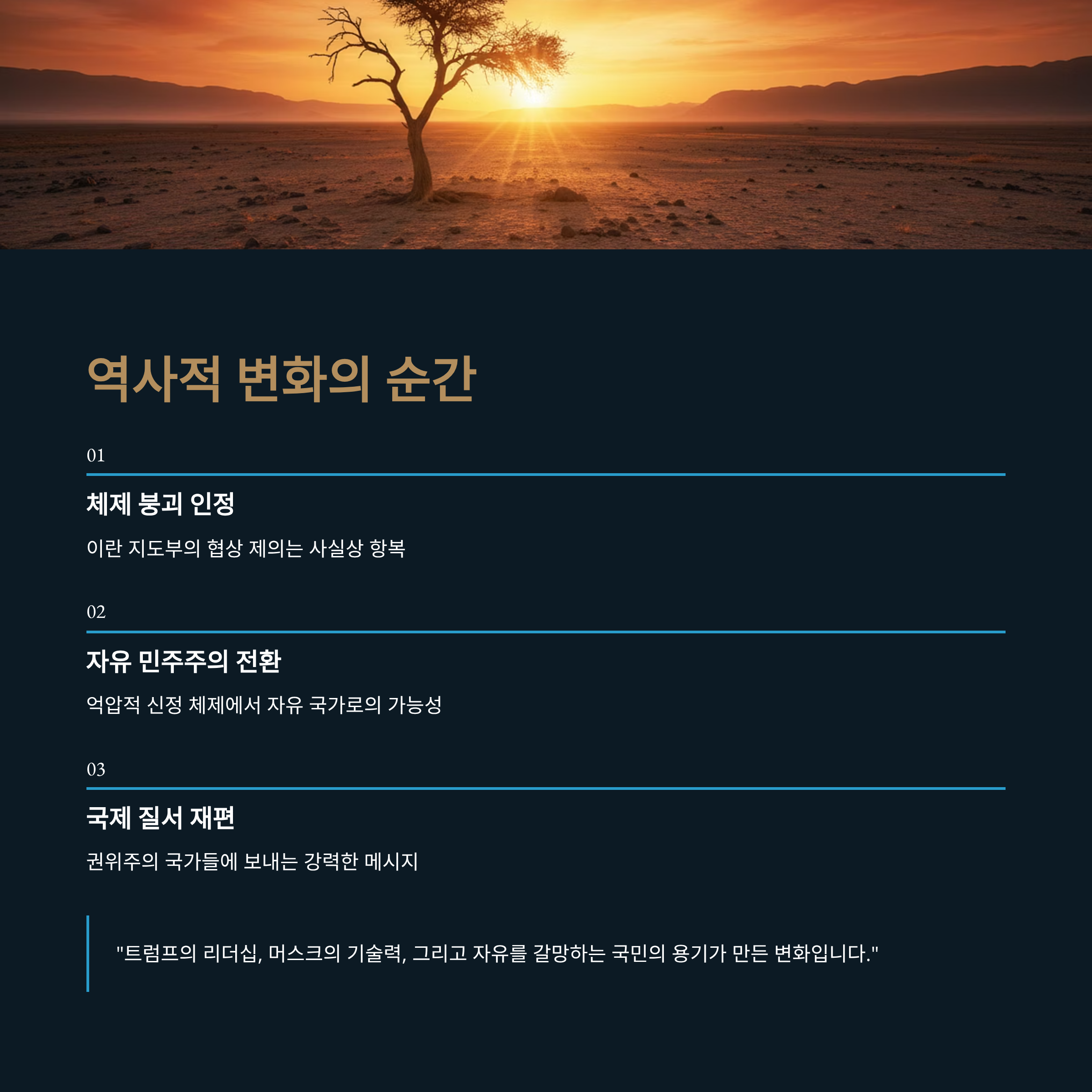 이란 사태는 억압적인 신정 체제가 한계점에 도달했음을 보여주는 역사적인 사건입니다. 트럼프 대통령의 강력한 리더십과 일론 머스크의 기술력, 그리고 무엇보다 자유를 갈망하는 이란 국민들의 용기가 결합되어 정권 교체라는 거대한 변화를 만들어내고 있습니다. 이란 지도부의 협상 제의는 사실상의 체제 붕괴를 인정한 것이나 다름없으며, 향후 자유 민주주의 국가로의 전환 가능성까지 열려 있습니다.