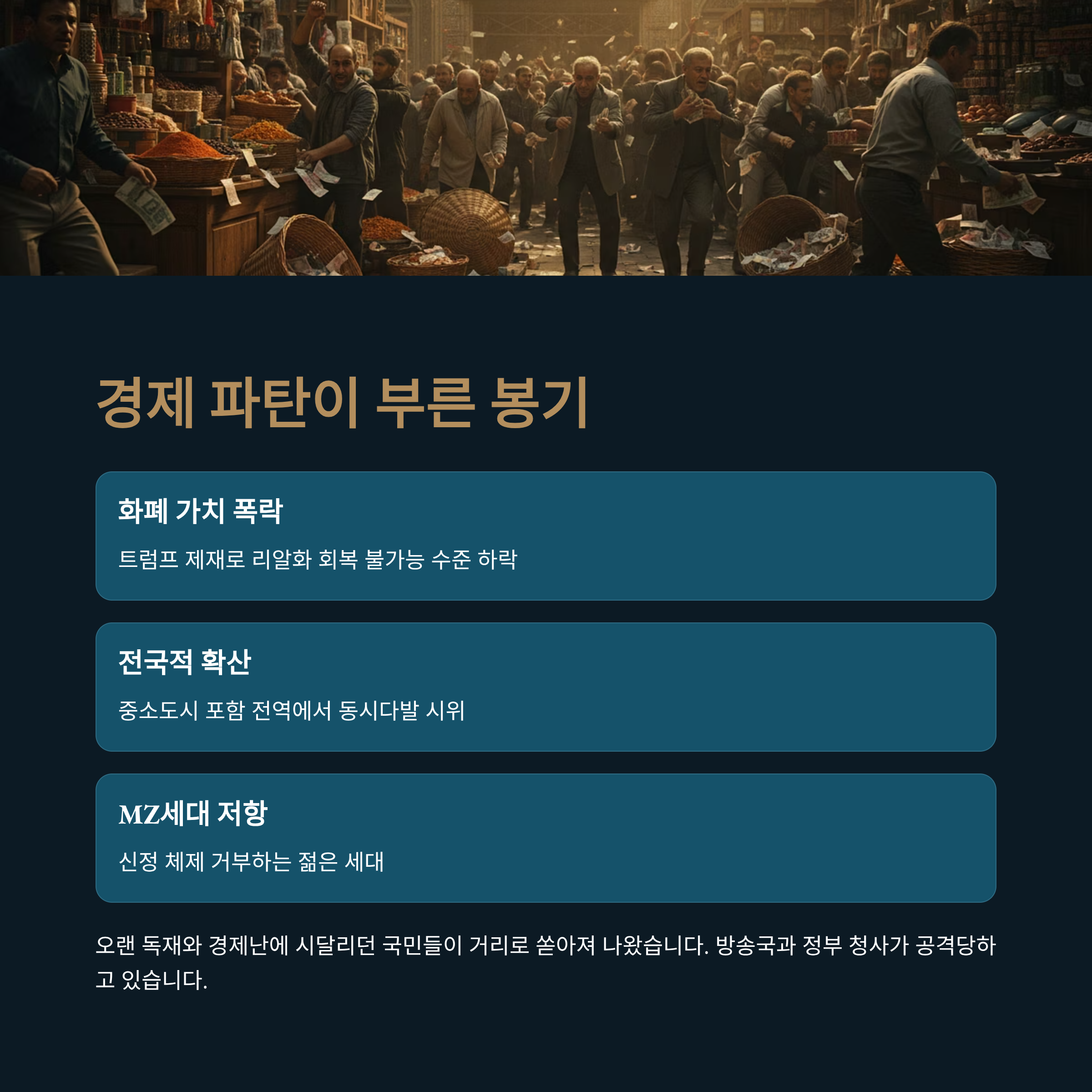 경제 제재의 효과: 트럼프 대통령 취임 이후 강화된 대이란 제재로 화폐 가치가 폭락하고 경제가 파탄 나면서 시민들의 저항이 임계점을 넘었습니다.
