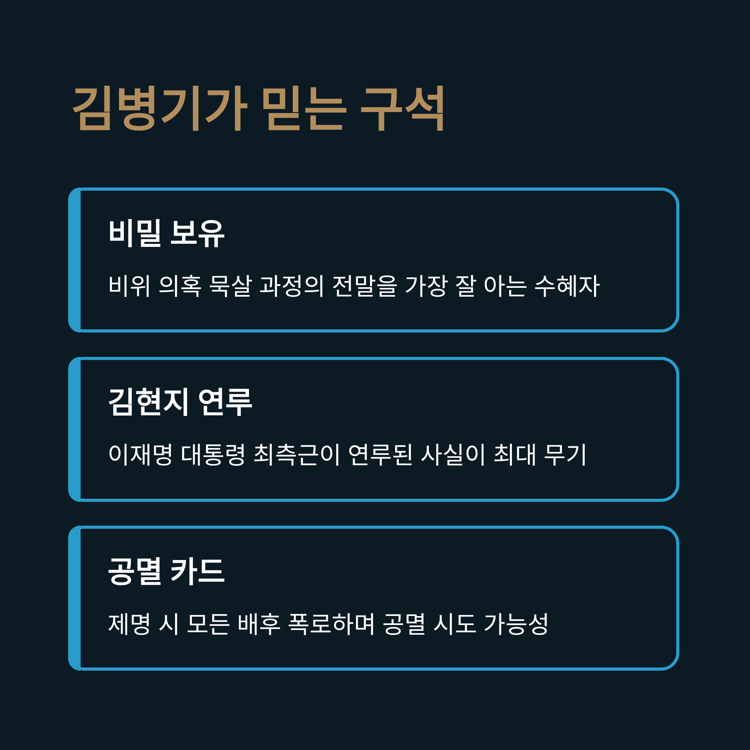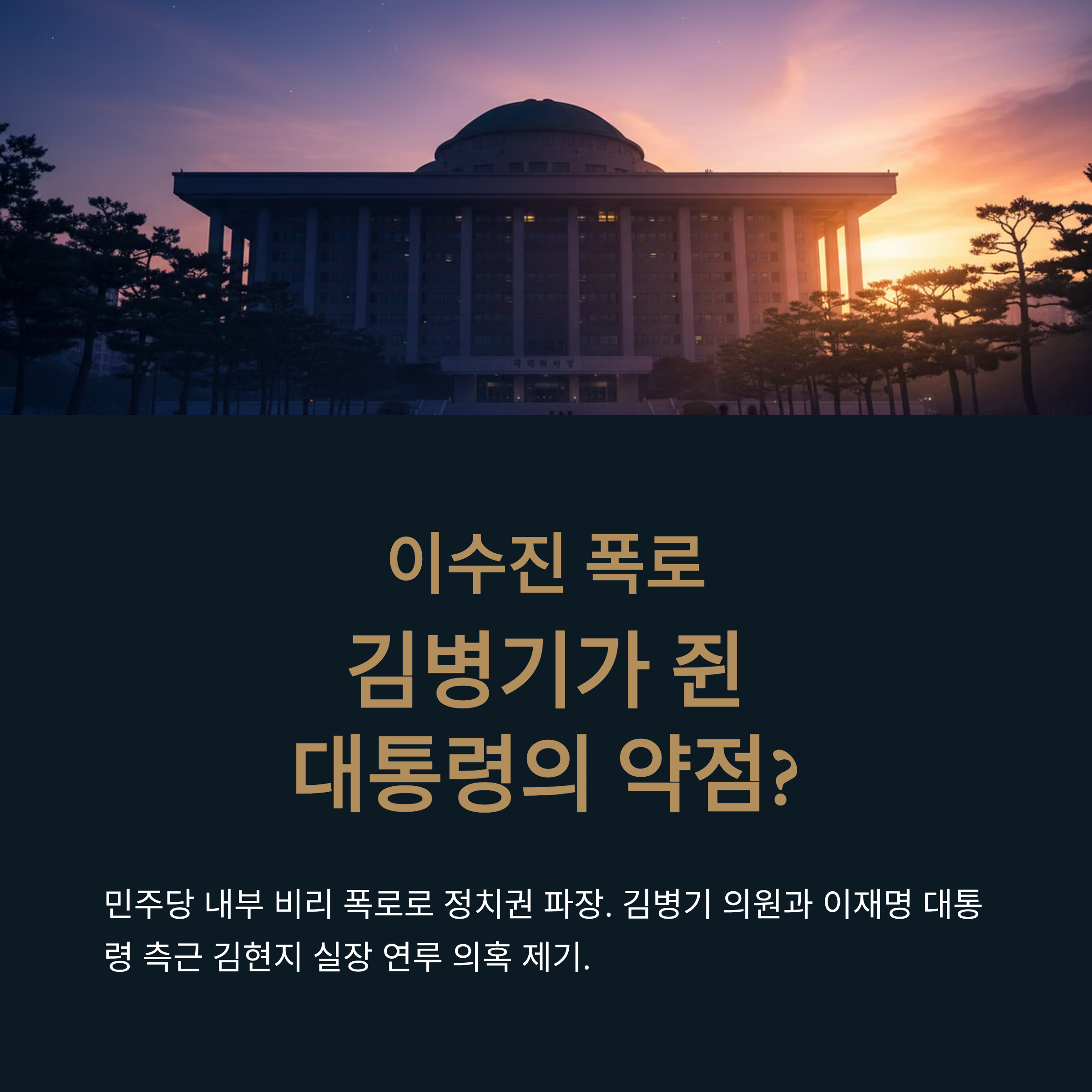 김병기 의원은 이수진 전 의원이 제출한 탄원서가 어떤 경로를 통해, 누구의 지시로 묵살되었는지 가장 잘 아는 수혜자입니다. 특히 그 과정에 이재명 대통령의 최측근인 김현지 실장이 연루되어 있다는 사실은, 이 문제를 단순한 개인 비리 차원에서 끝낼 수 없게 만듭니다. 만약 당이 자신을 제명하는 극단적인 조치를 취할 경우, 김 의원은 이 모든 과정의 배후를 폭로하며 '공멸'을 시도할 수 있습니다. 이것이 그가 당의 징계 압박에도 흔들리지 않는 가장 큰 이유로 보입니다.