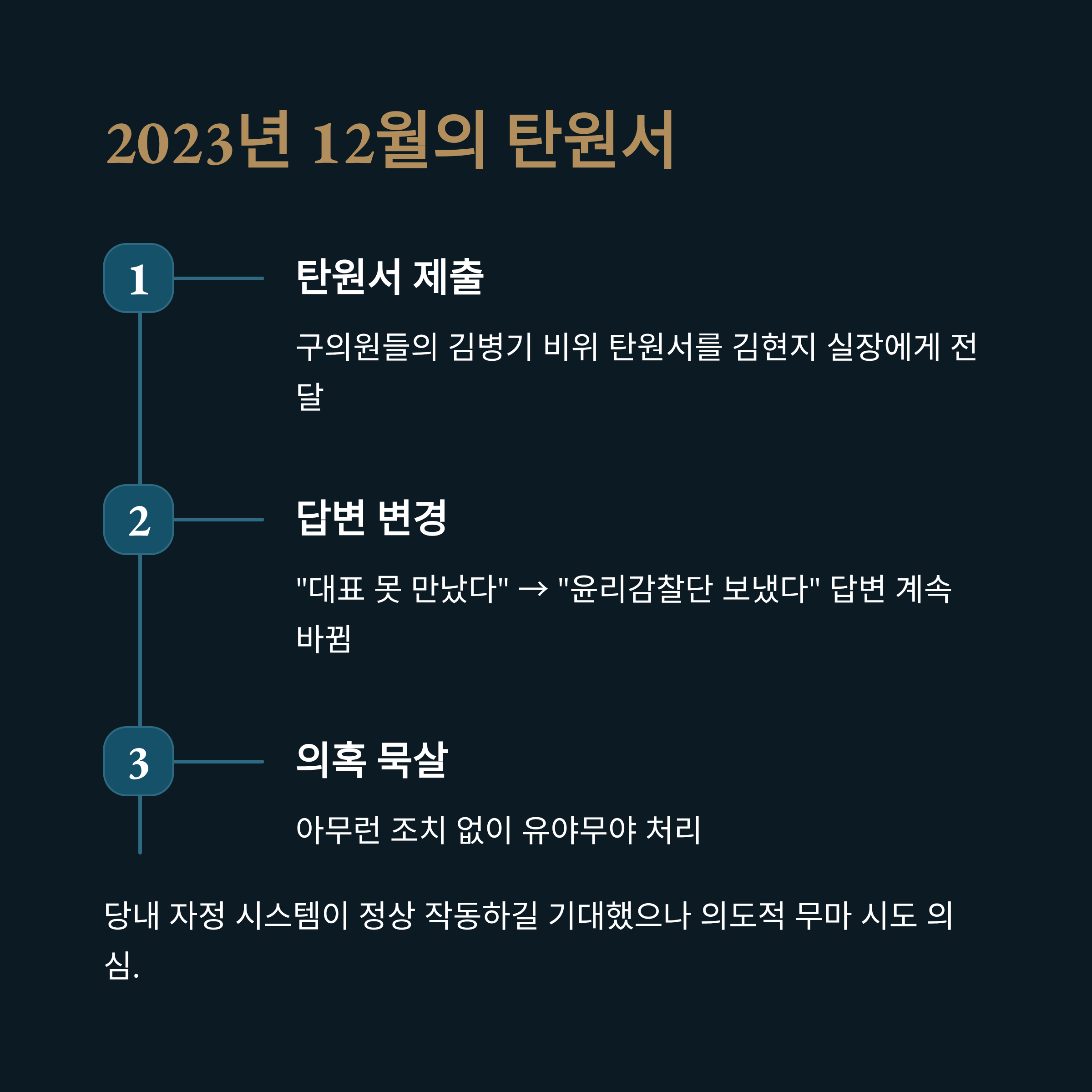 이러한 폭로는 김병기 의원 개인의 비리를 넘어, 당 지도부의 문제 해결 의지와 방식을 문제 삼고 있습니다. 탄원서가 접수된 이후, 처리 과정에 대한 질문에 "대표를 못 만났다", "윤리감찰단에 보냈다", "검증위원장에게 보냈다"는 식으로 답변이 계속 바뀌다가 결국 유야무야된 정황은, 의혹을 덮으려는 의도적인 무마 시도가 있었음을 시사합니다. 이 칼날은 김병기 의원을 향하고 있지만, 그를 비호한 것으로 의심되는 보이지 않는 손, 즉 당시 지도부를 향한 것이기도 합니다.