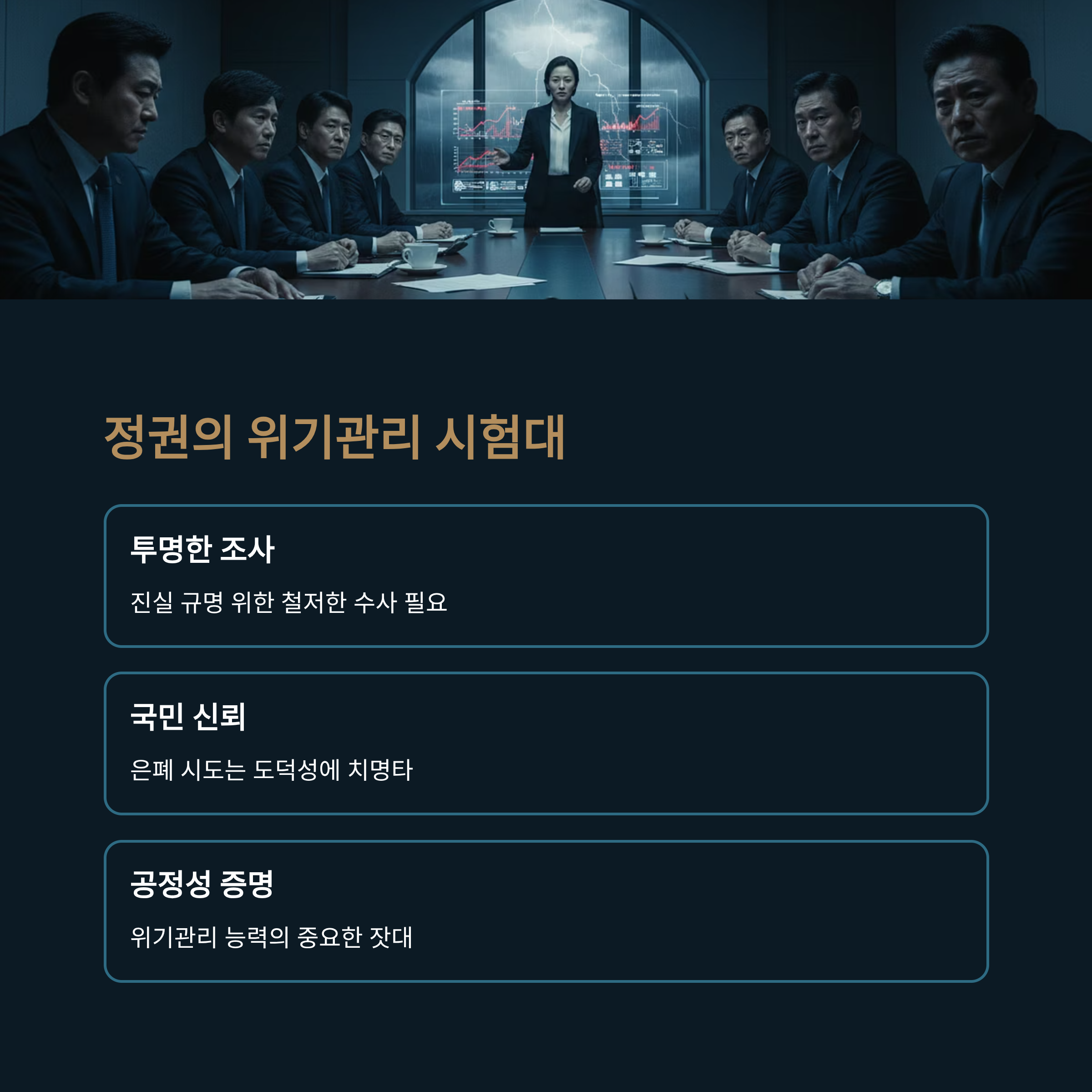 민주당과 대통령실은 이 의혹을 개인의 일탈로 치부하며 어물쩍 넘어가려 해서는 안 됩니다. 진실을 규명하기 위한 투명하고 철저한 조사를 진행하여 국민적 의혹을 해소해야 합니다. 만약 이 사건을 덮는 데 급급한 모습을 보인다면, 이는 정권의 도덕성에 치명적인 상처를 남기고 국민의 신뢰를 완전히 잃는 결과로 이어질 것입니다. 이 사건의 처리 과정은 현 정권의 위기관리 능력과 공정성을 가늠하는 중요한 잣대가 될 것입니다.