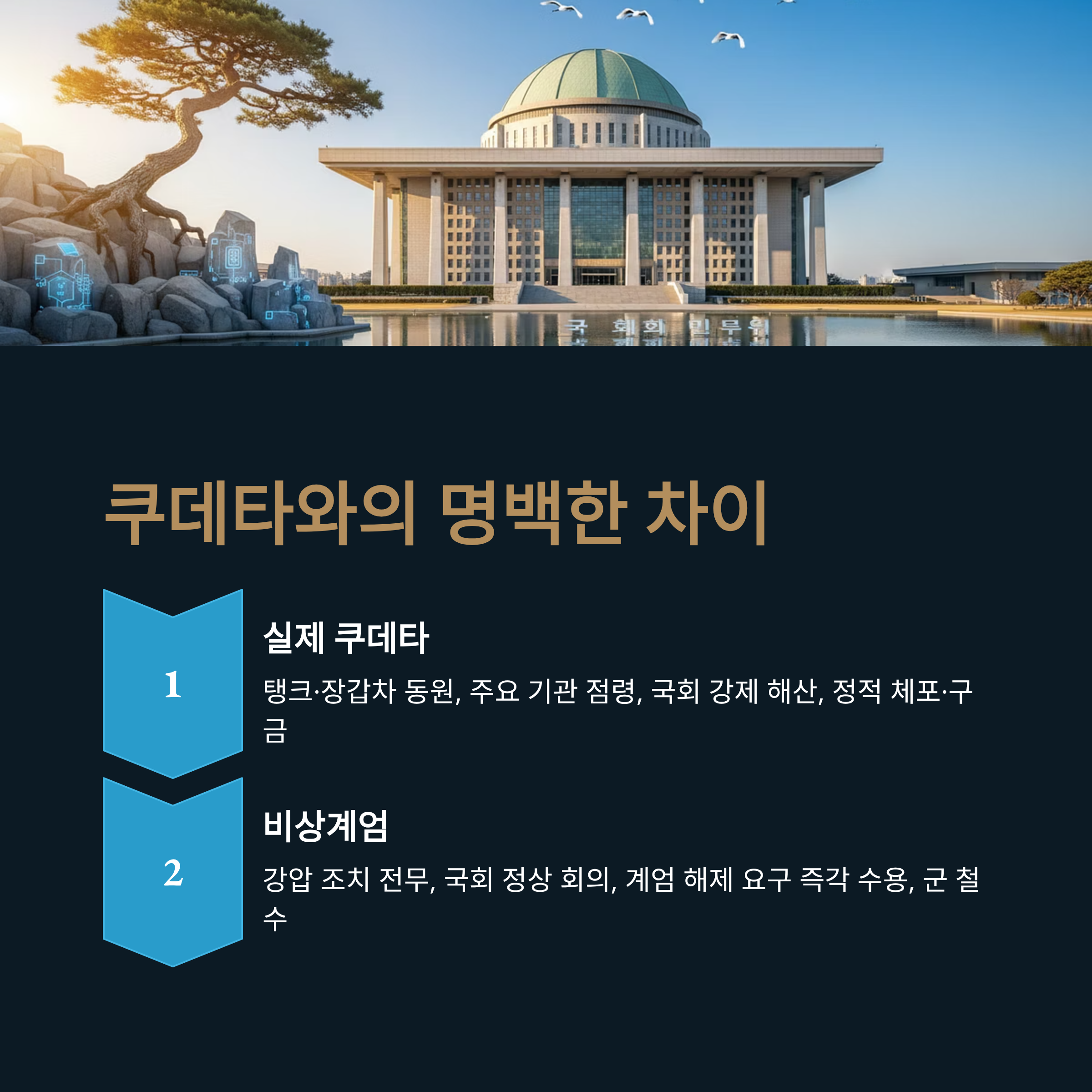 - 쿠데타와의 명백한 차이: 대규모 병력 동원, 정적 체포가 없었으며 국회 의결에 따라 즉각 계엄을 해제한 점에서 과거 쿠데타와는 본질적으로 다릅니다.