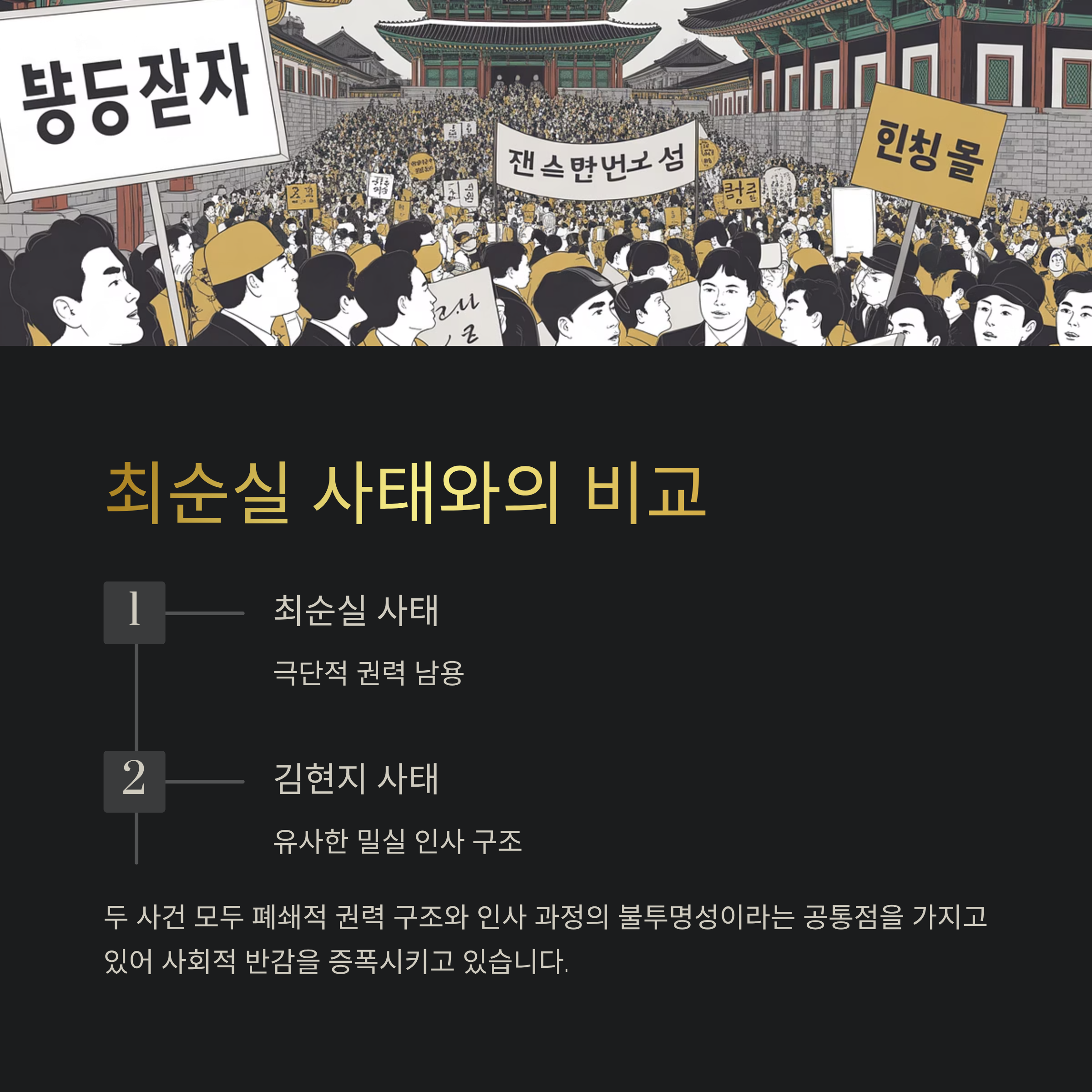 | Q. 이번 사태가 최순실 사건과 비교되는 이유는 무엇인가요? |