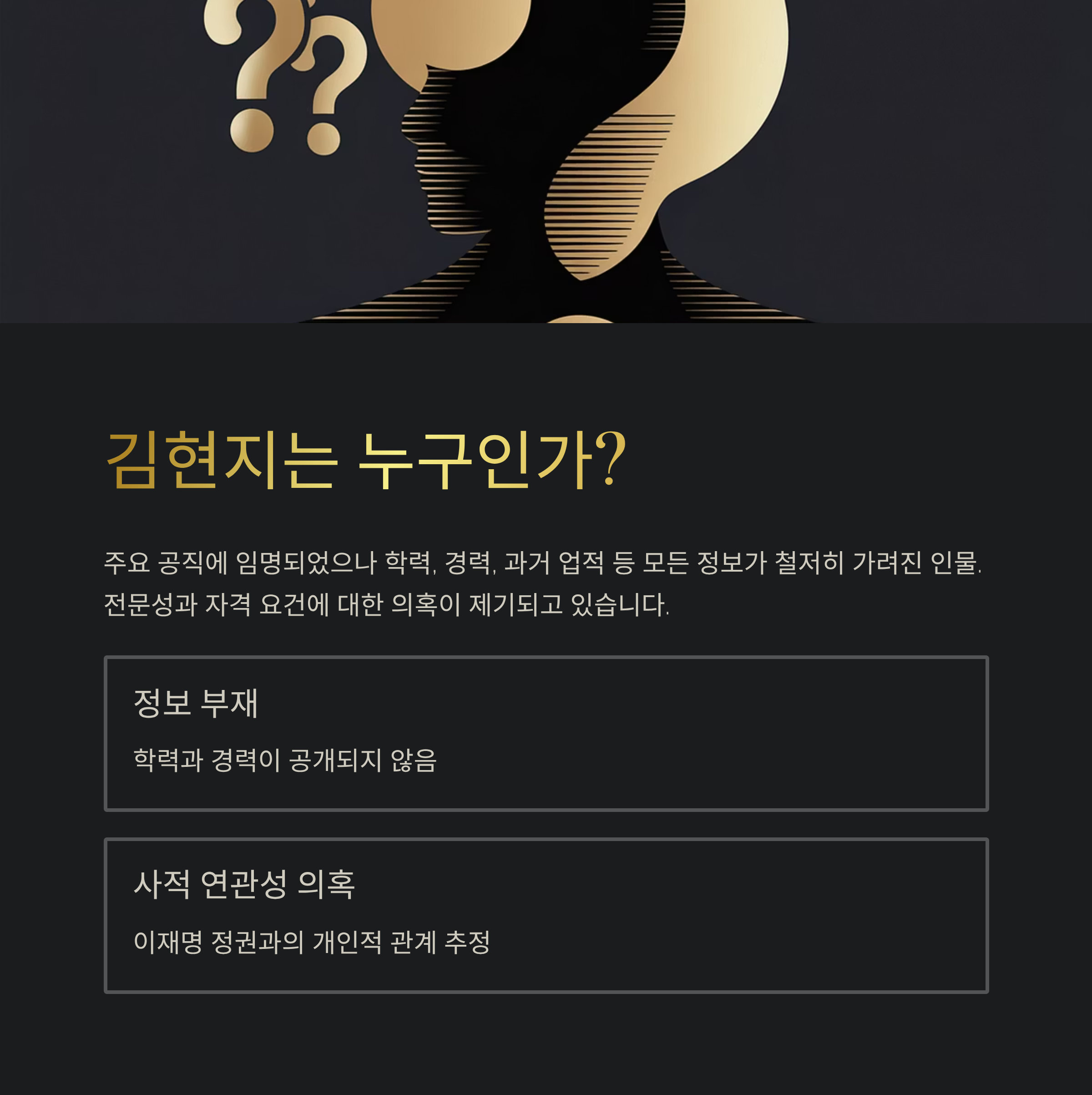 | A. 김현지가 주요 공직에 임명된 인물로, 이력이나 배경 정보가 제대로 공개되지 않아 그 자격과 적합성에 대한 대중적 의문이 제기되고 있으며, 정부 인사 시스템에 대한 신뢰를 흔드는 사례로 지적되고 있습니다. |