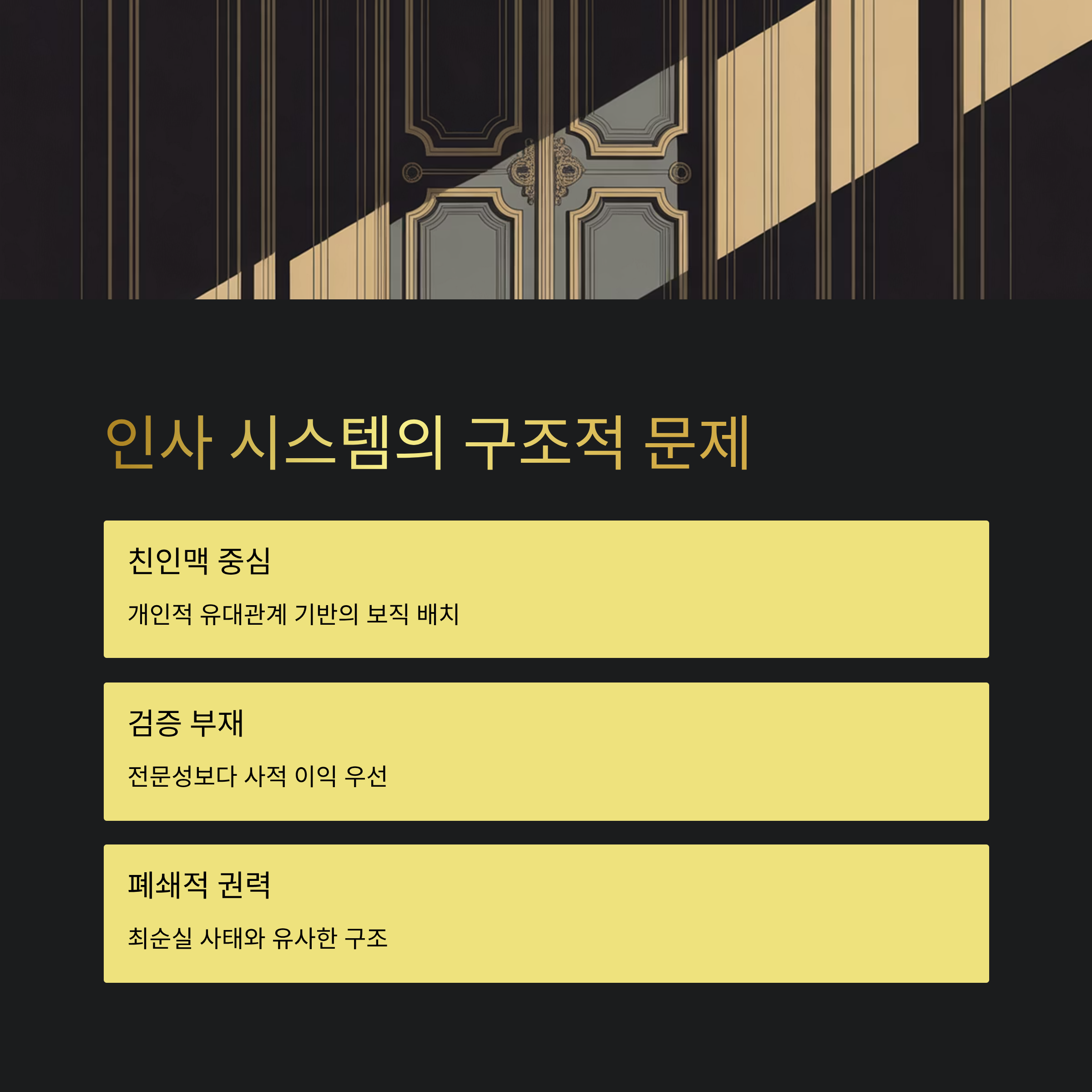 김현지 사례에서 나타난 두 번째 면은 현재 정부의 인사 정책 전반에 걸친 구조적 문제입니다. 이재명 정권은 초기부터 주요 보직을 친인맥 및 개인적 유대관계를 기반으로 하는 경향을 보여왔다는 비판을 받아왔습니다. 이러한 행보는 적합성과 관련된 논란을 확대시키며, 최순실 사태와 같이 권력 공유의 폐쇄성에 대한 대중적 반감으로 이어지고 있습니다. 김현지 임명은 이재명 정권의 인사 철학이 단순히 공적 기여보다 사적 이익을 우선시하는 모습으로 비춰질 가능성을 드러냈습니다.
