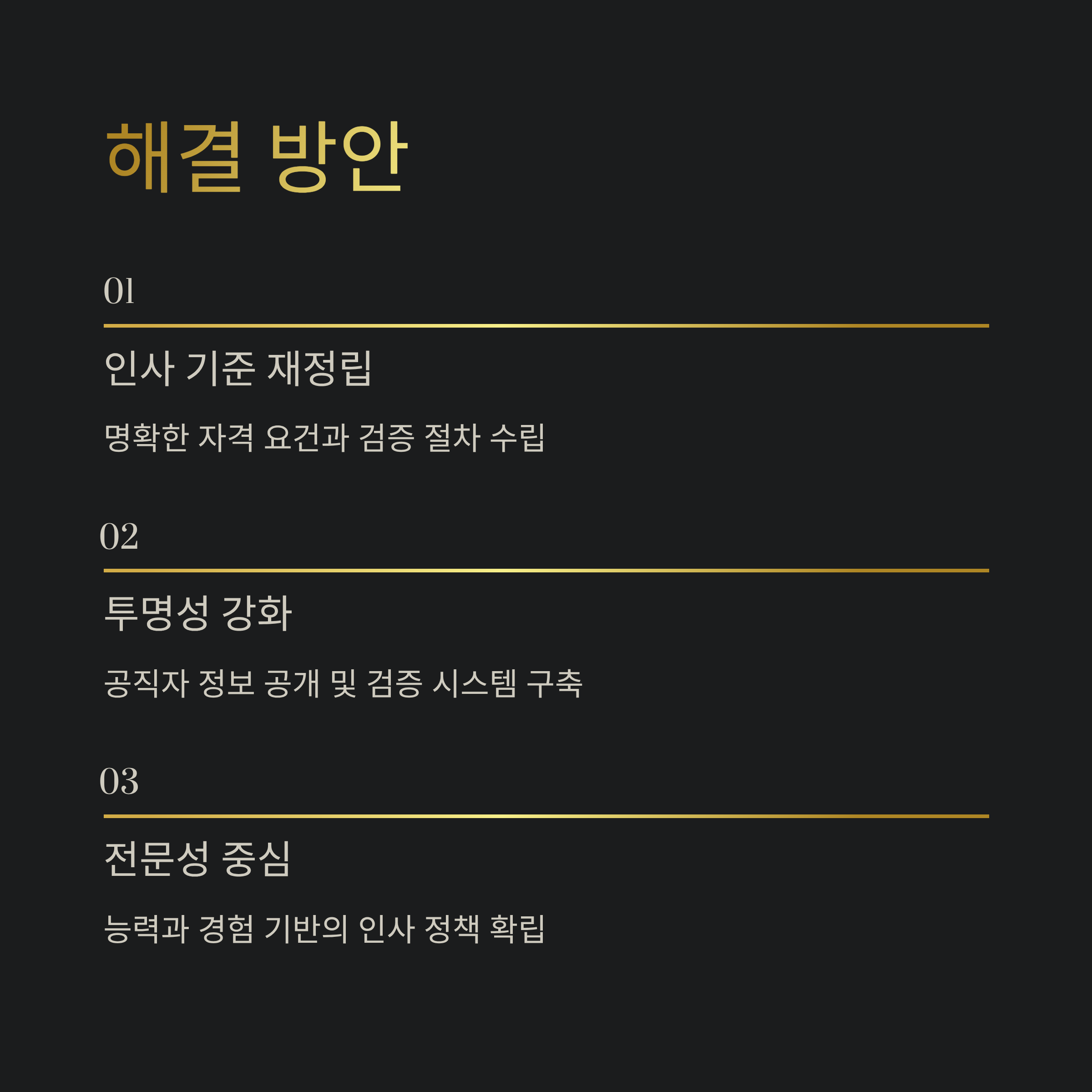 | A. 정부는 공직 인사 철학을 국민들에게 명확히 제시하고, 전문가와 검증된 기준을 바탕으로 삼아 현재 시스템의 투명성과 신뢰성을 확보해야 할 필요가 있습니다. |