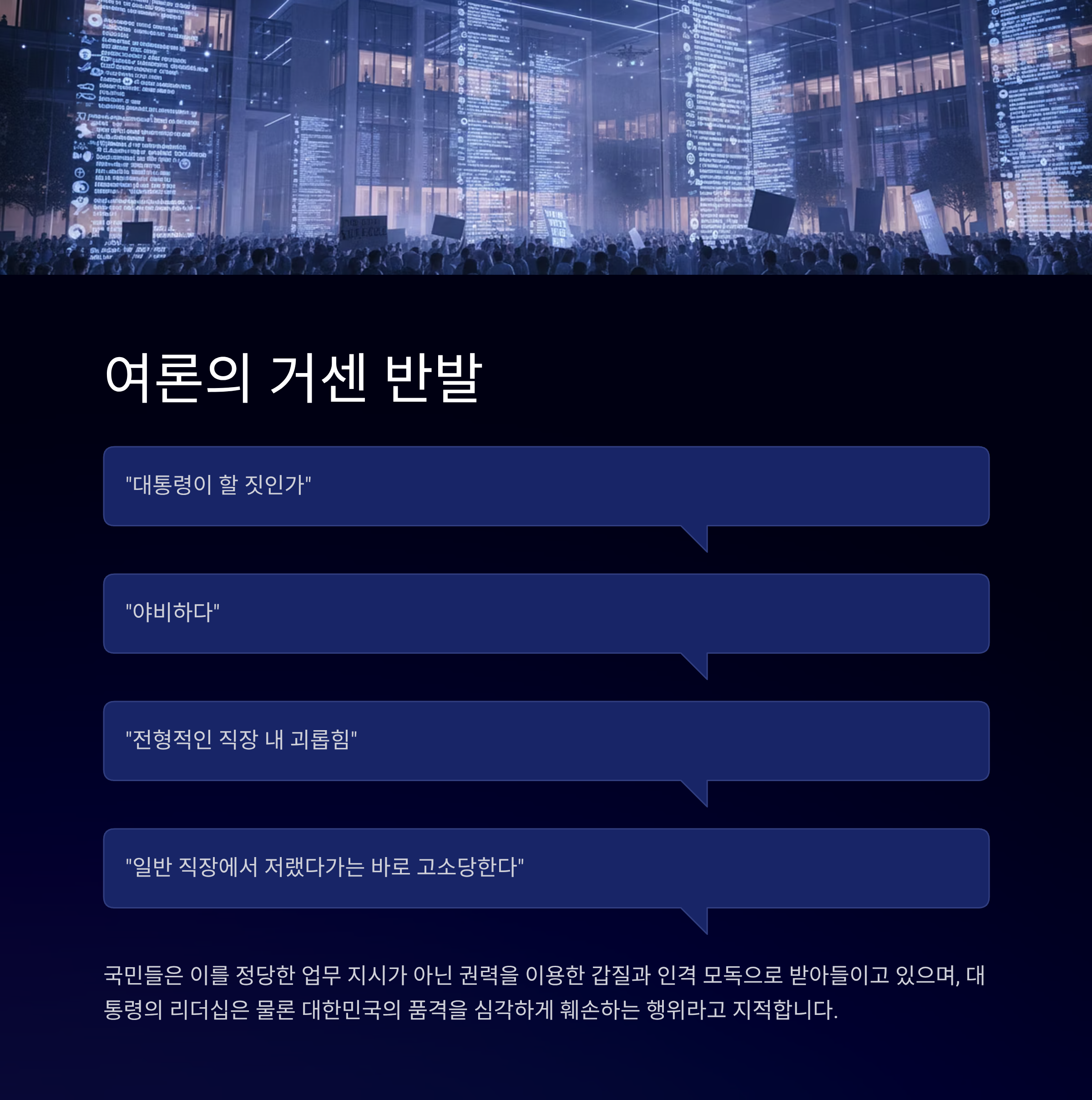 이러한 모습에 여론은 싸늘한 반응을 보이고 있습니다. 온라인 댓글에는 "대통령이 할 짓인가", "야비하다", "전형적인 직장 내 괴롭힘이다", "일반 직장에서 저랬다가는 바로 고소당한다" 등 비판이 쏟아졌습니다. 국민들은 이를 정당한 업무 지시가 아닌, 권력을 이용한 '갑질'과 '인격 모독'으로 받아들이고 있으며, 이는 대통령의 리더십은 물론 대한민국의 품격을 심각하게 훼손하는 행위라는 지적이 많습니다.