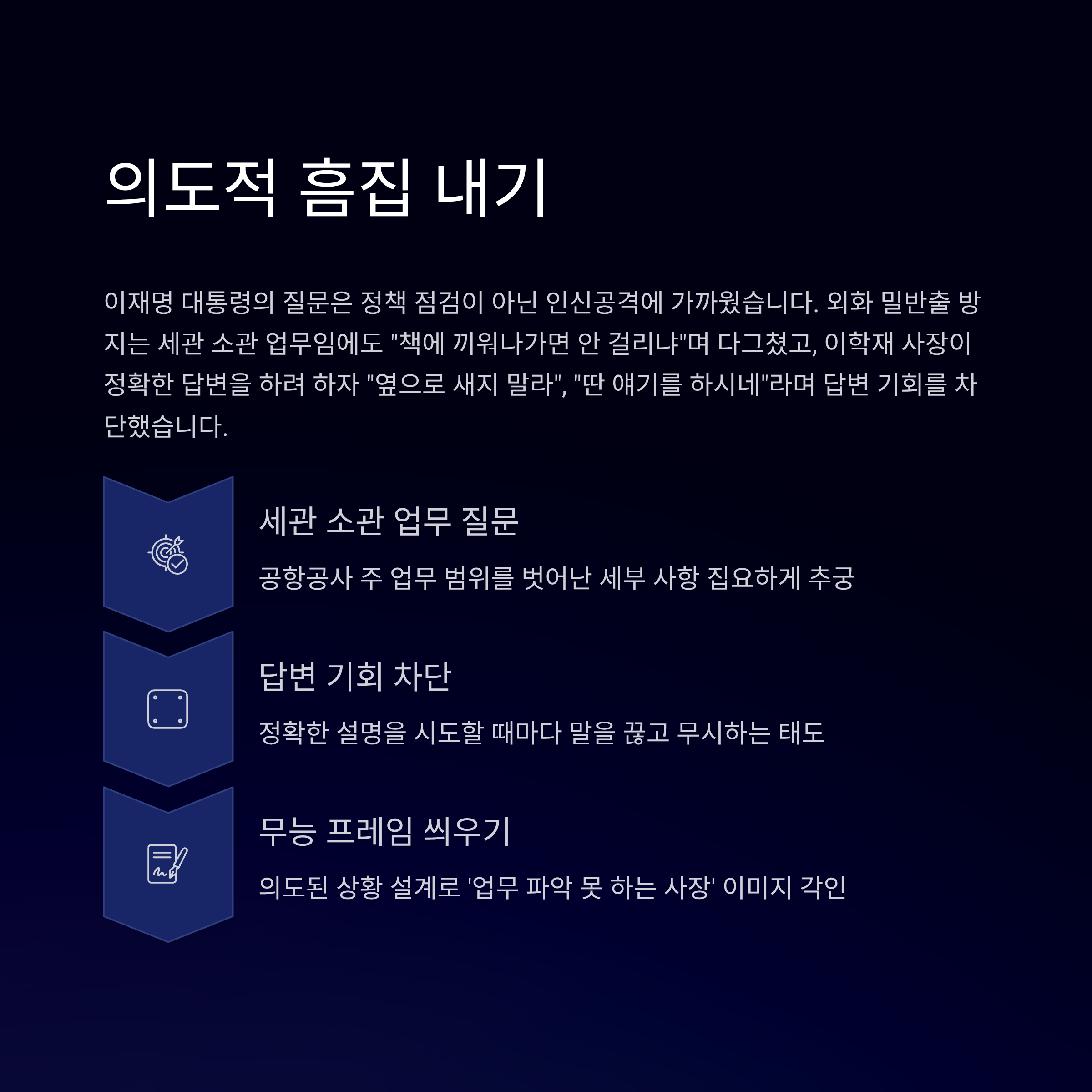 이재명 대통령의 질의는 정책 점검이 아닌 인신공격성 흠집 내기에 가까웠습니다. 그는 이학재 사장에게 1만 달러 이상 외화 밀반출 방지 문제를 물으며 "책에 끼워나가면 안 걸리냐"고 다그쳤습니다. 이에 이 사장은 해당 업무가 주로 세관 소관이며, 공사는 유해 물질 검색이 주 업무지만 협력하여 적발 시 세관에 넘긴다고 원론적이고 정확한 답변을 했습니다. 하지만 이 대통령은 "옆으로 새지 말라", "자꾸만 딴 얘기를 하시네"라며 답변할 기회를 막고 무안을 주었습니다.