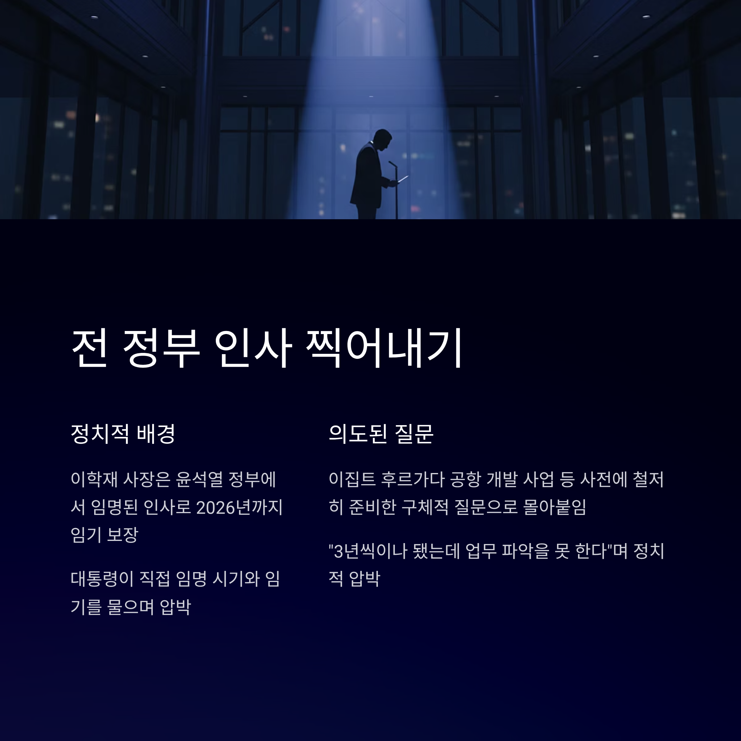 이번 공개 질책의 배경에는 이학재 사장이 윤석열 정부에서 임명된 인사라는 점이 자리 잡고 있습니다. 이 사장은 2023년 6월에 임명되어 2026년까지 3년의 임기가 보장된 인물입니다. 이 대통령은 이 사장의 답변 태도를 문제 삼은 뒤, 임명 시기와 임기를 직접 물으며 "3년씩이나 됐는데 업무 파악을 그렇게 못 하고 있다"고 비난했습니다. 이는 사실상 '아직도 자리를 지키고 있느냐'는 정치적 압박과 다름없습니다.