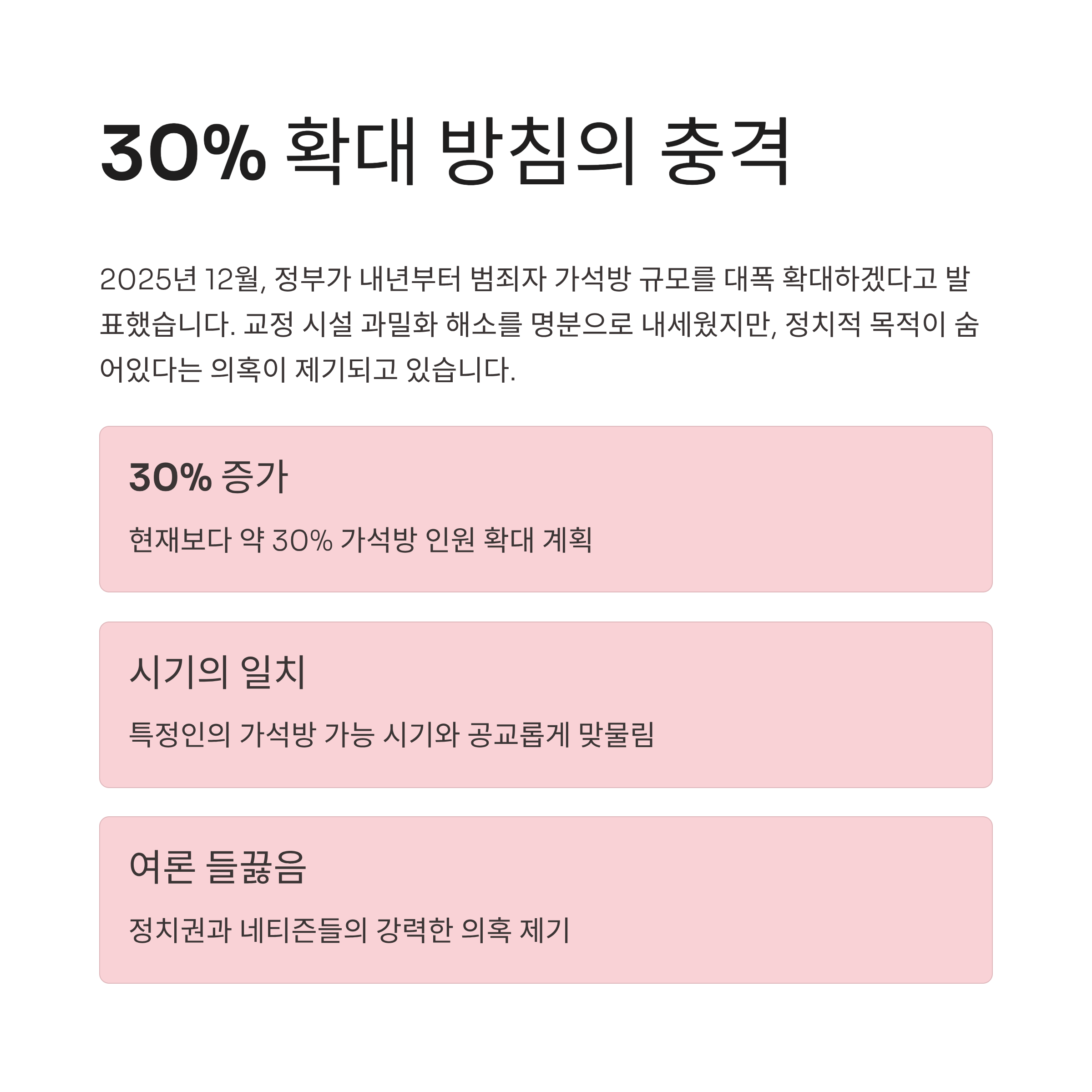가석방 규모 30% 확대 방침은 교정 시설 과밀 해소를 명분으로 하지만, 심사 기준 완화로 인한 치안 불안을 야기할 수 있다는 비판을 받습니다.
