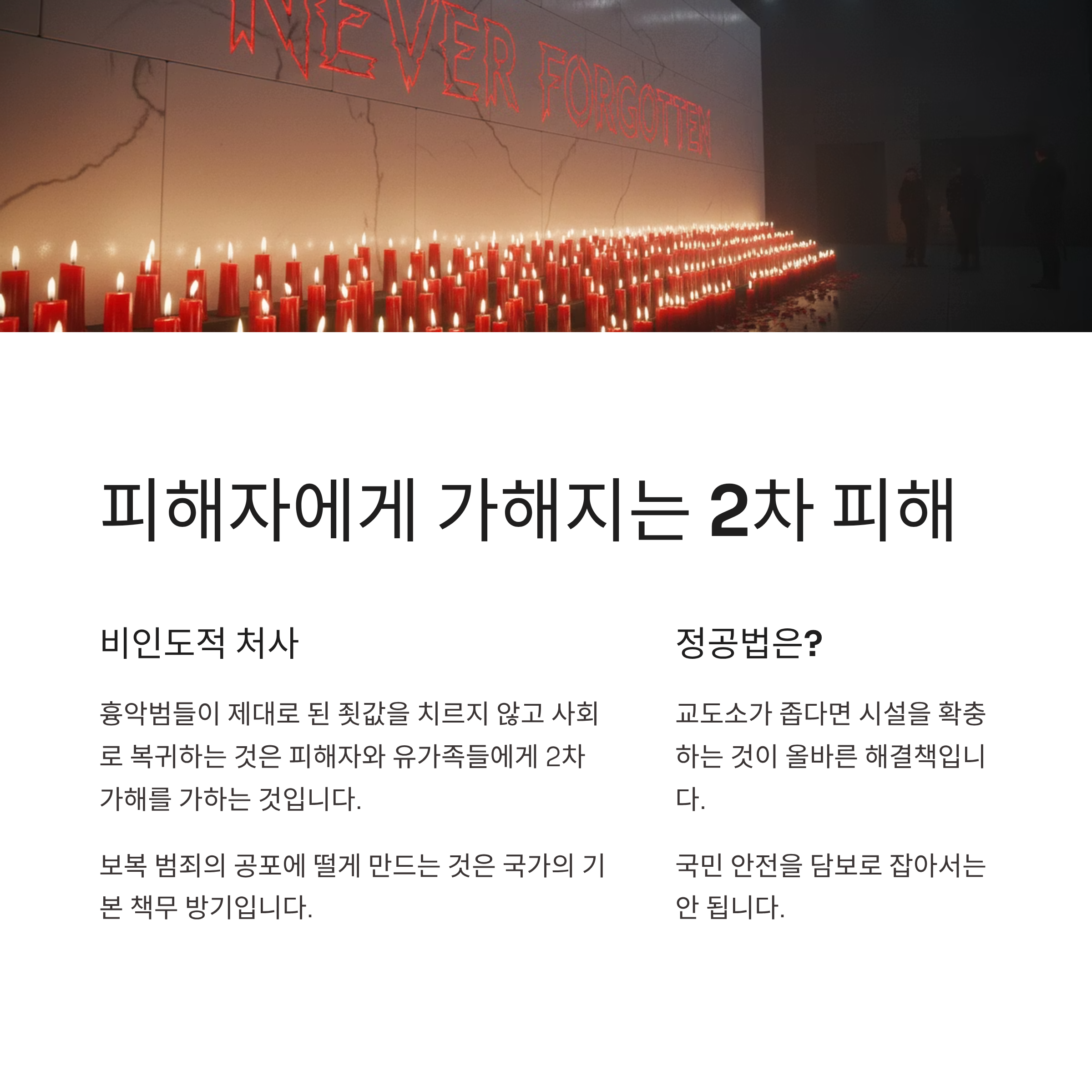 이는 잠재적 범죄자들에게 "죄를 지어도 적당히 버티면 금방 나올 수 있다"는 잘못된 신호를 주어 범죄 억제력을 약화시킵니다. 또한, 흉악범들이 제대로 된 죗값을 치르지 않고 사회로 복귀하는 것은 피해자와 유가족들에게 2차 가해를 가하는 것이며, 보복 범죄의 공포에 떨게 만드는 비인도적 처사입니다. 교도소가 좁다면 시설을 확충하는 것이 정공법이지, 범죄자를 풀어주어 국민의 안전을 담보로 잡는 것은 국가의 기본 책무를 방기하는 것입니다.