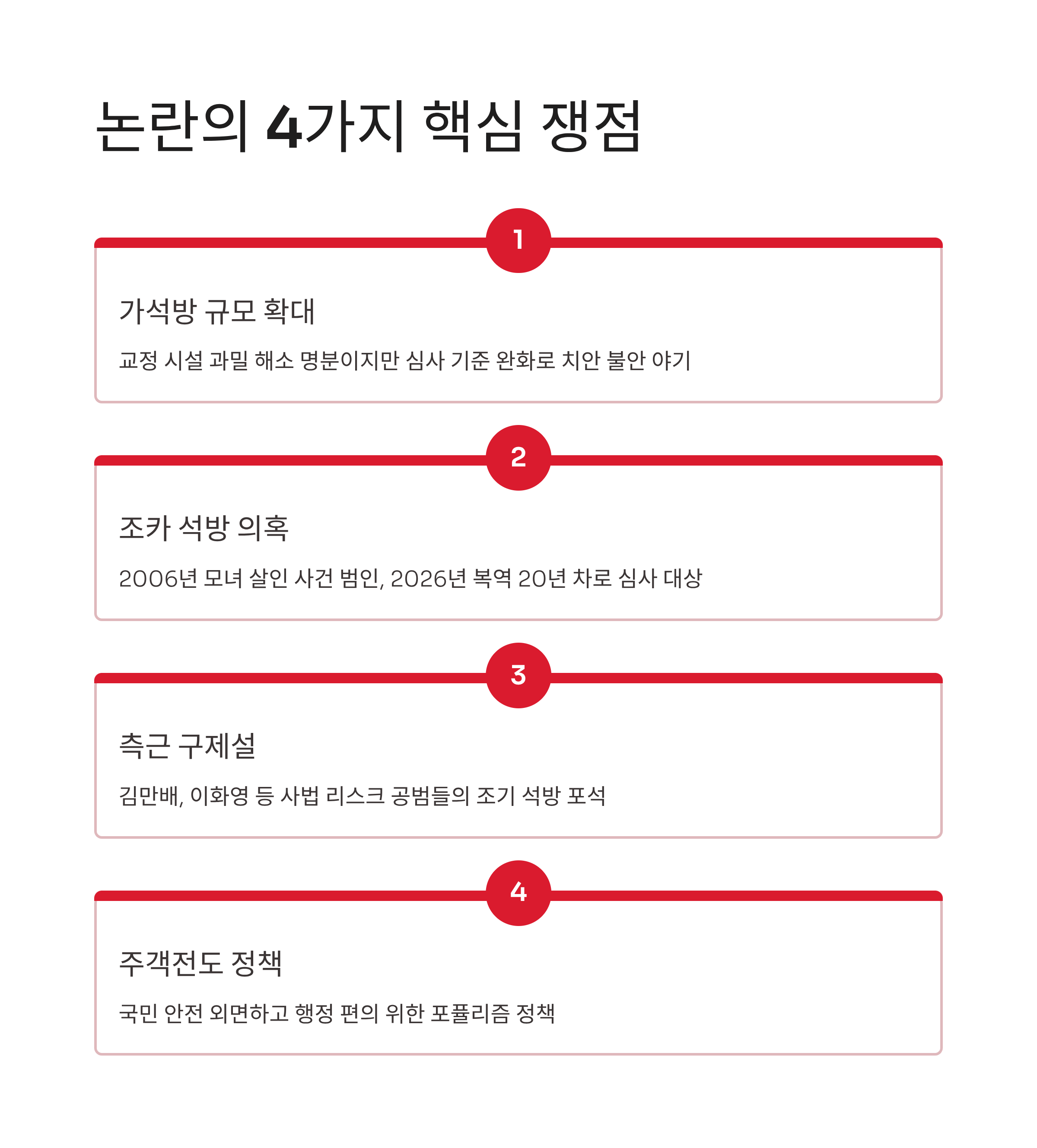 이번 논란의 핵심은 정부의 가석방 확대 정책이 '특정인 구제'를 위한 수단으로 악용될 소지가 있다는 점입니다. 주요 내용은 다음과 같습니다.