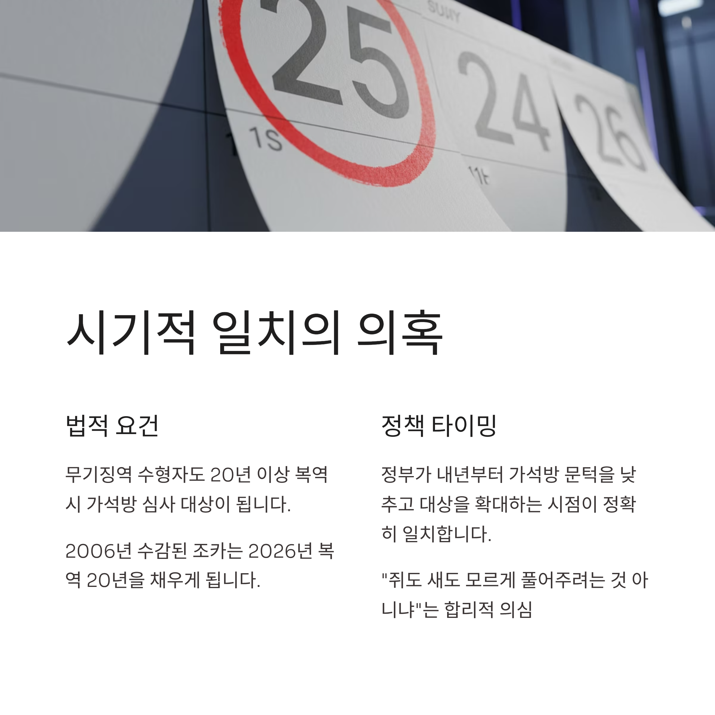 현행 형법상 무기징역을 선고받더라도 20년 이상 복역하면 가석방 심사 대상이 될 수 있습니다. 2006년에 수감된 조카는 2026년이 되면 복역 20년을 채우게 됩니다. 정부가 내년부터 가석방 문턱을 낮추고 대상을 확대하려는 시점이 공교롭게도 조카의 가석방 가능 시기와 맞물리면서, "대통령이 조카를 쥐도 새도 모르게 풀어주려는 것 아니냐"는 합리적 의심이 제기되고 있습니다. 이는 단순한 우연으로 치부하기에는 시기적 일치성이 너무나 뚜렷하여 여론의 불신을 키우고 있습니다.