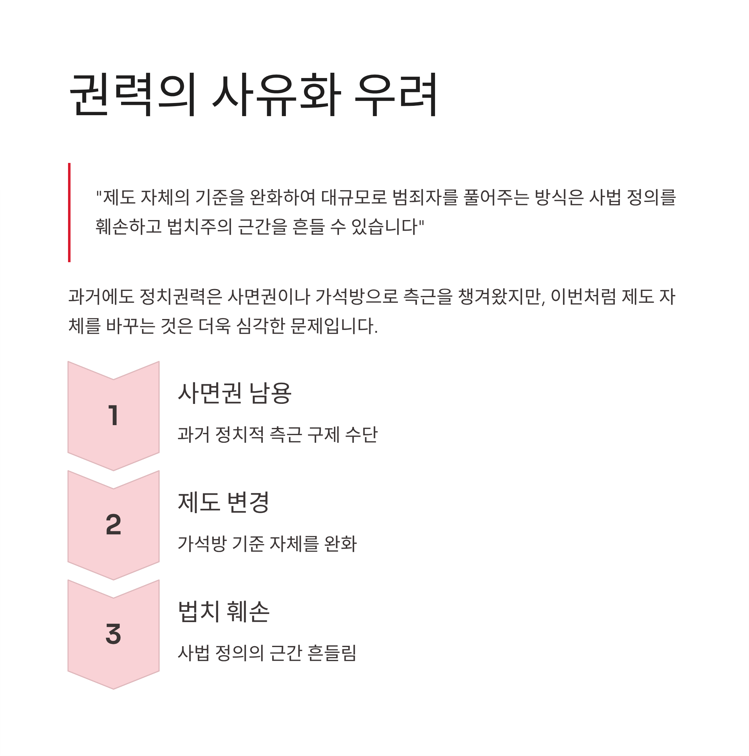 현재 관련 재판이 진행 중이거나 형이 확정되는 과정에서, 이들이 감옥에서 입을 열지 않도록 회유하거나 보상 차원에서 조기 석방의 길을 열어주는 것이라는 해석입니다. 과거에도 정치권력은 사면권이나 가석방을 통해 측근을 챙기는 모습을 보여왔습니다. 그러나 이번처럼 제도 자체의 기준을 완화하여 대규모로 범죄자를 풀어주는 방식은 사법 정의를 훼손하고 법치주의 근간을 흔들 수 있다는 점에서 더욱 심각한 우려를 낳고 있습니다. 만약 이것이 사실이라면 권력의 사유화라는 비판을 피하기 어려울 것입니다.