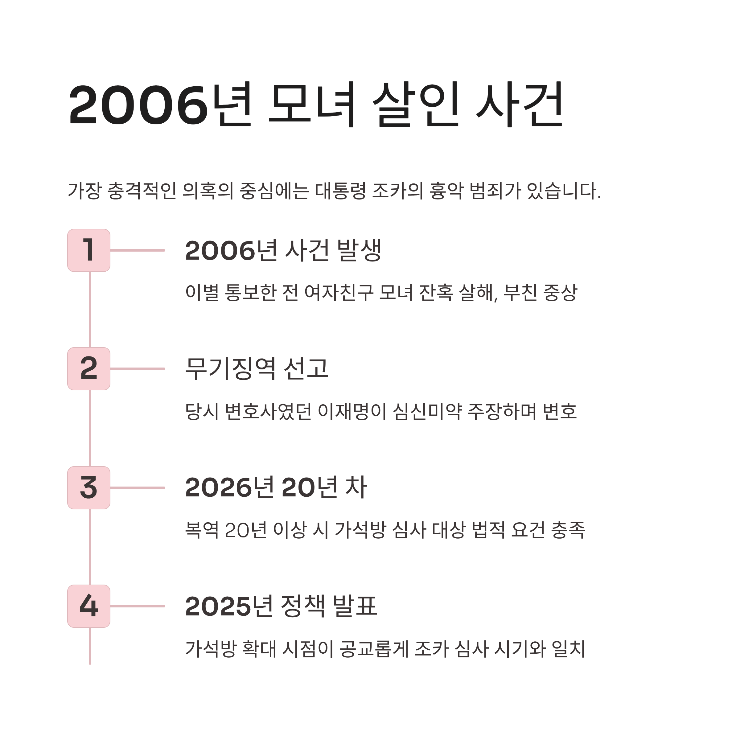 이재명 대통령 조카 석방 의혹은 2006년 모녀 살인 사건으로 무기징역을 선고받은 조카가 2026년 복역 20년 차로 가석방 심사 대상이 된다는 점에서 불거졌습니다.