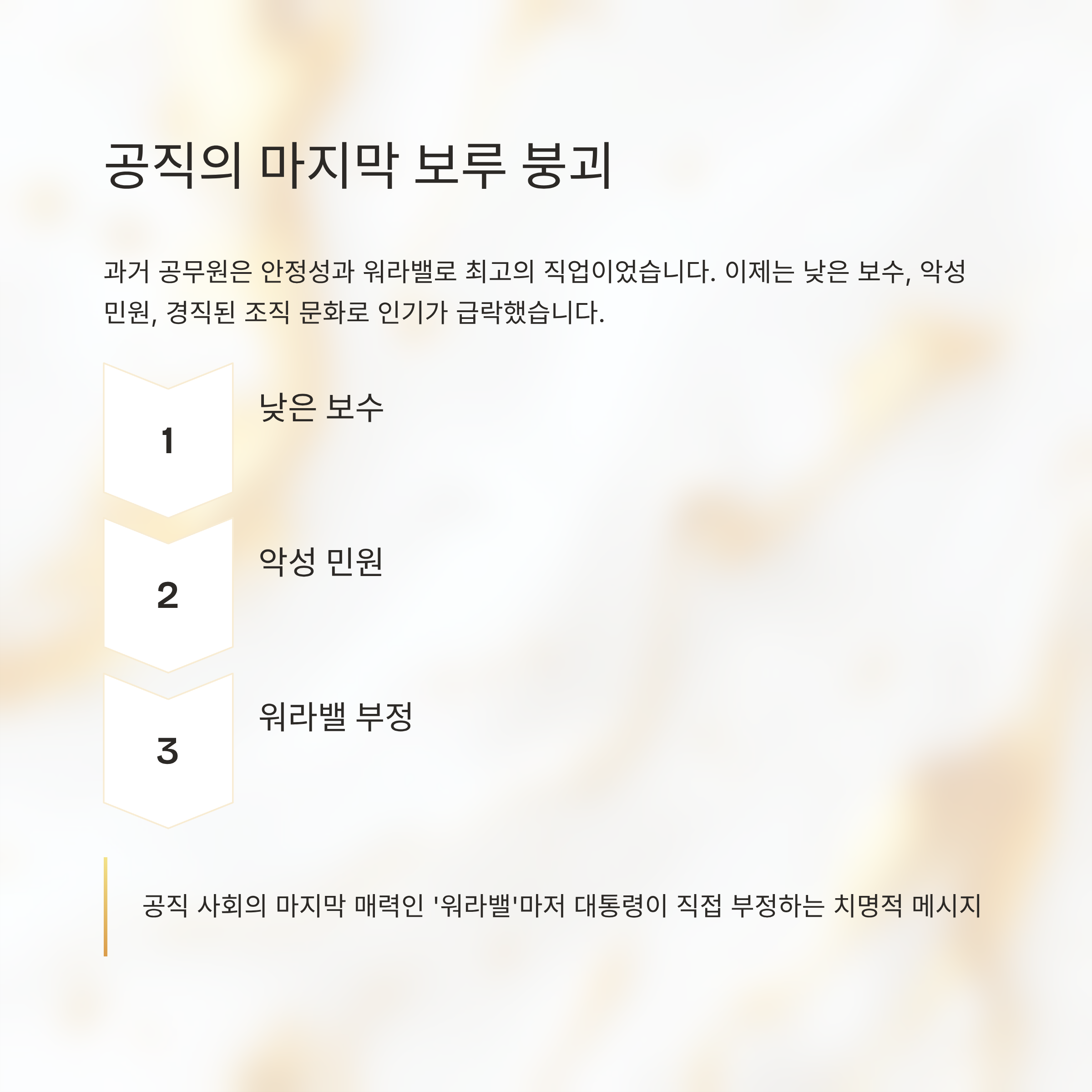 이러한 상황에서 공무원 조직의 마지막 보루로 여겨지던 '워라밸'마저 대통령이 직접 나서서 부정하는 메시지를 던진 것은 치명적입니다. 이는 유능한 인재들이 공직을 외면하게 만드는 결정적인 계기가 될 수 있습니다. 국가에 대한 봉사나 사명감만으로 열악한 처우와 과도한 업무를 감내하라는 요구는 더 이상 젊은 세대에게 통하지 않습니다. 공직 사회의 매력도를 높이고 유능한 인재를 유치하기 위한 근본적인 대책 마련이 시급한 시점입니다.