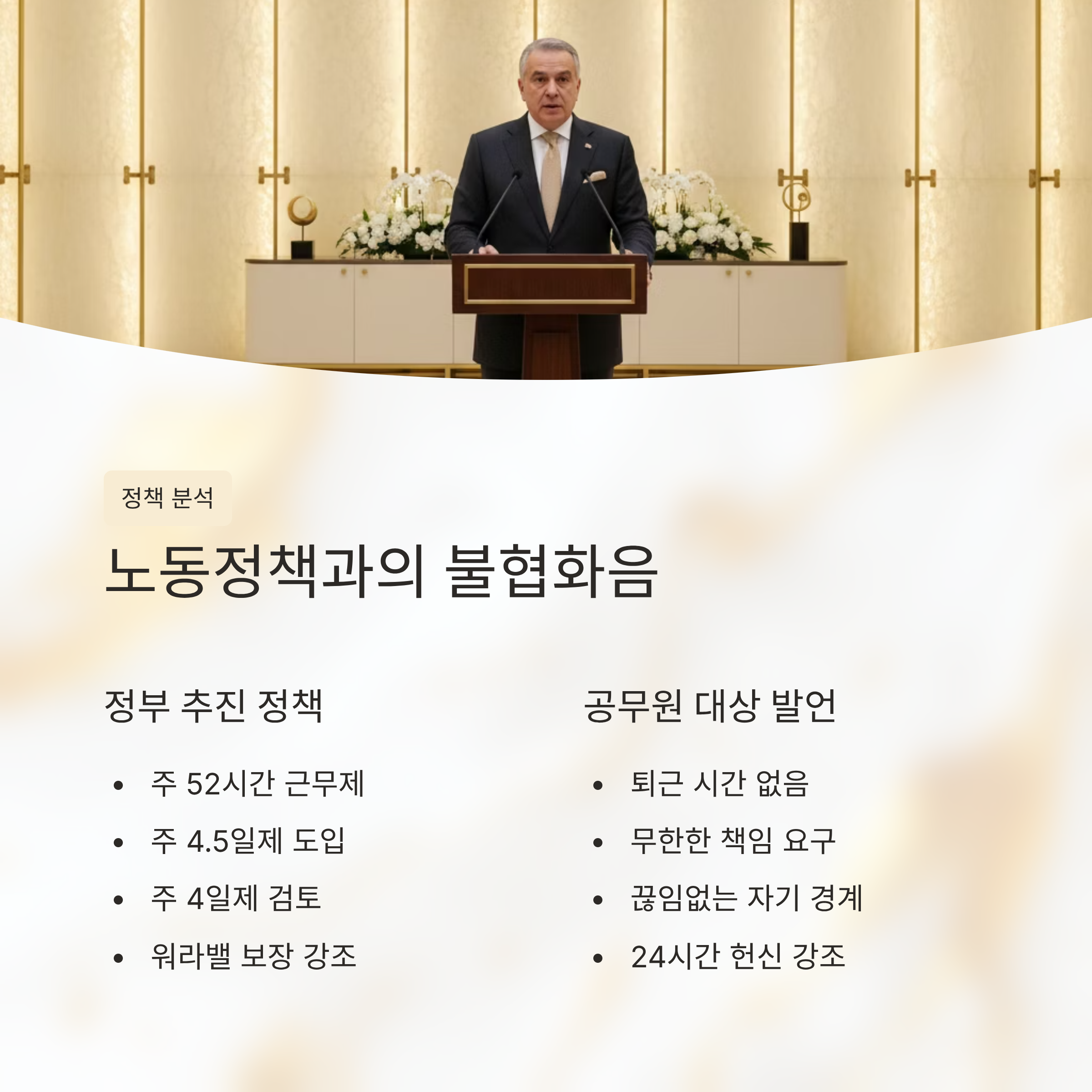 이번 발언은 이재명 정부가 추진하는 핵심 노동정책과도 정면으로 배치됩니다. 현 정부는 노동자의 '워라밸' 보장을 국정 과제로 삼고 주 52시간 근무제를 넘어 주 4.5일제, 나아가 주 4일제 도입까지 거론하고 있습니다. 이는 노동시간 단축이 시대적 흐름이라는 사회적 합의에 기반한 것입니다. 이러한 상황에서 대통령이 유독 공무원 조직에만 '퇴근 없는 노동'을 강조하는 것은 이중잣대라는 비판을 받을 수밖에 없습니다.