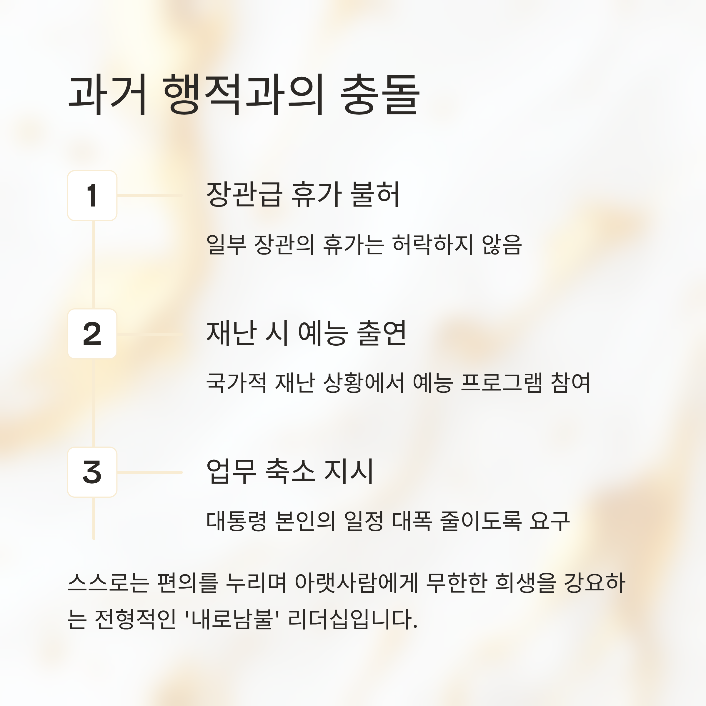 더욱이 국가적 재난 상황에서 예능 프로그램에 출연하거나, "대선에 또 나갈 것도 아닌데 일정이 너무 많다"며 업무량 축소를 지시했다는 사실이 알려지면서 비판은 더욱 거세지고 있습니다. 스스로는 편의와 휴식을 최대한 누리면서 아랫사람에게는 무한한 희생과 충성을 강요하는 모습은 전형적인 '내로남불' 리더십이라는 지적을 피하기 어렵습니다. 이러한 과거 행적은 이번 발언의 설득력을 크게 떨어뜨리는 요인으로 작용하고 있습니다.