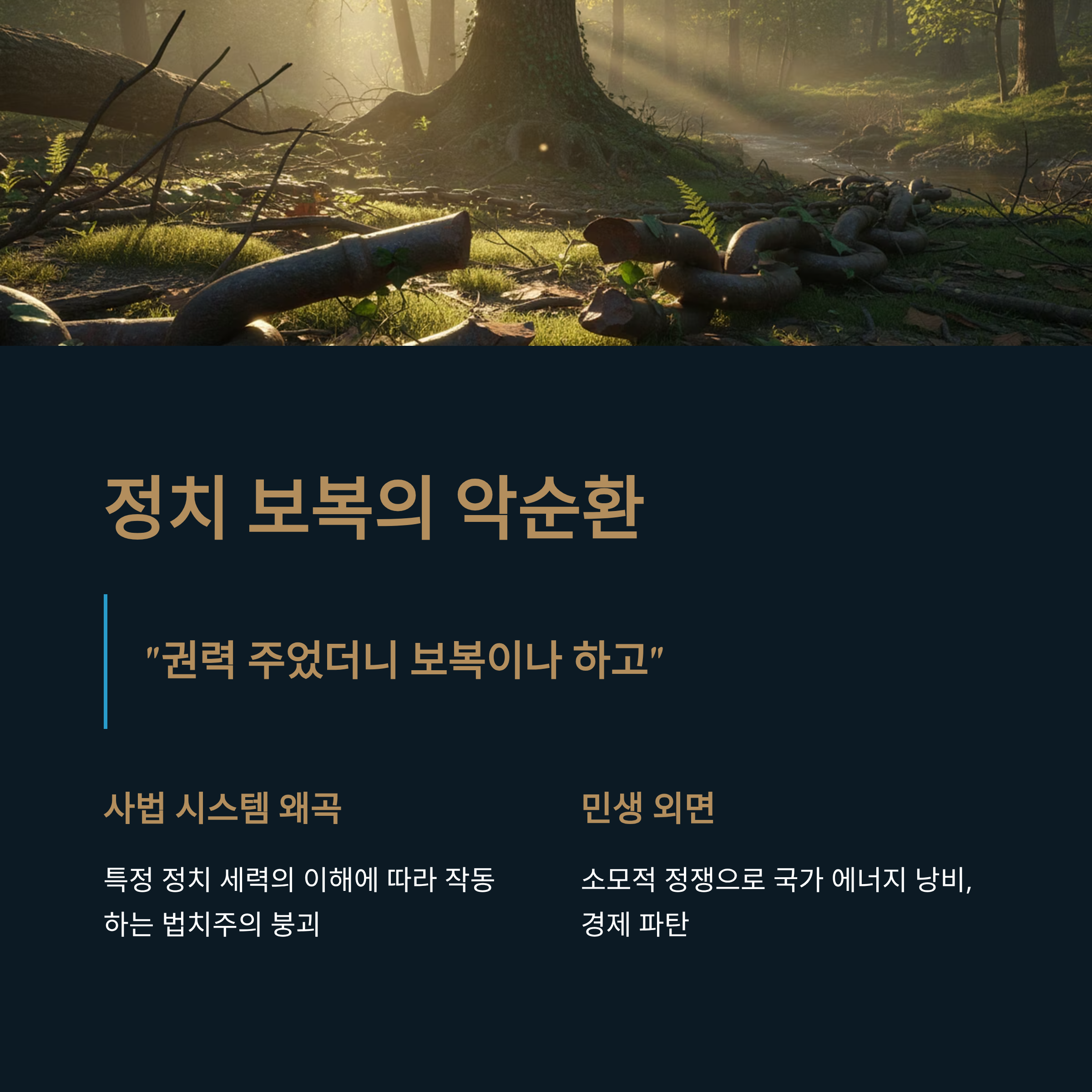 이러한 정치 보복의 악순환은 국가 에너지를 소모적인 정쟁에 낭비하게 만들어 결국 민생에 심각한 타격을 줍니다.