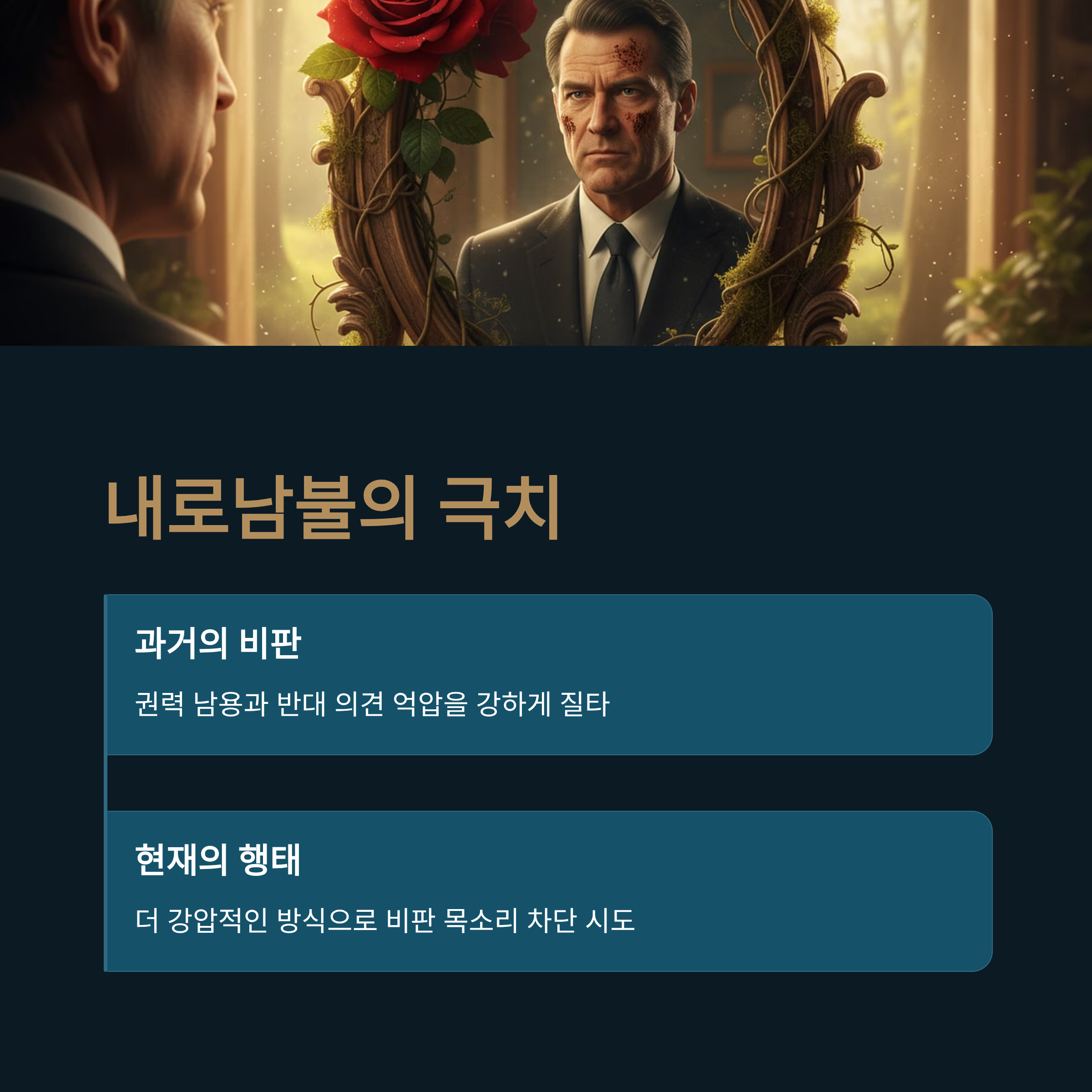 권력자가 비판을 수용하지 않고, 오히려 권력으로 그 목소리를 억누르려 한다면 이는 독재로 가는 위험한 신호입니다.